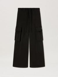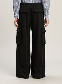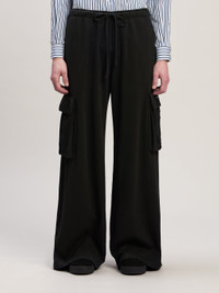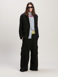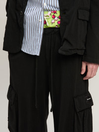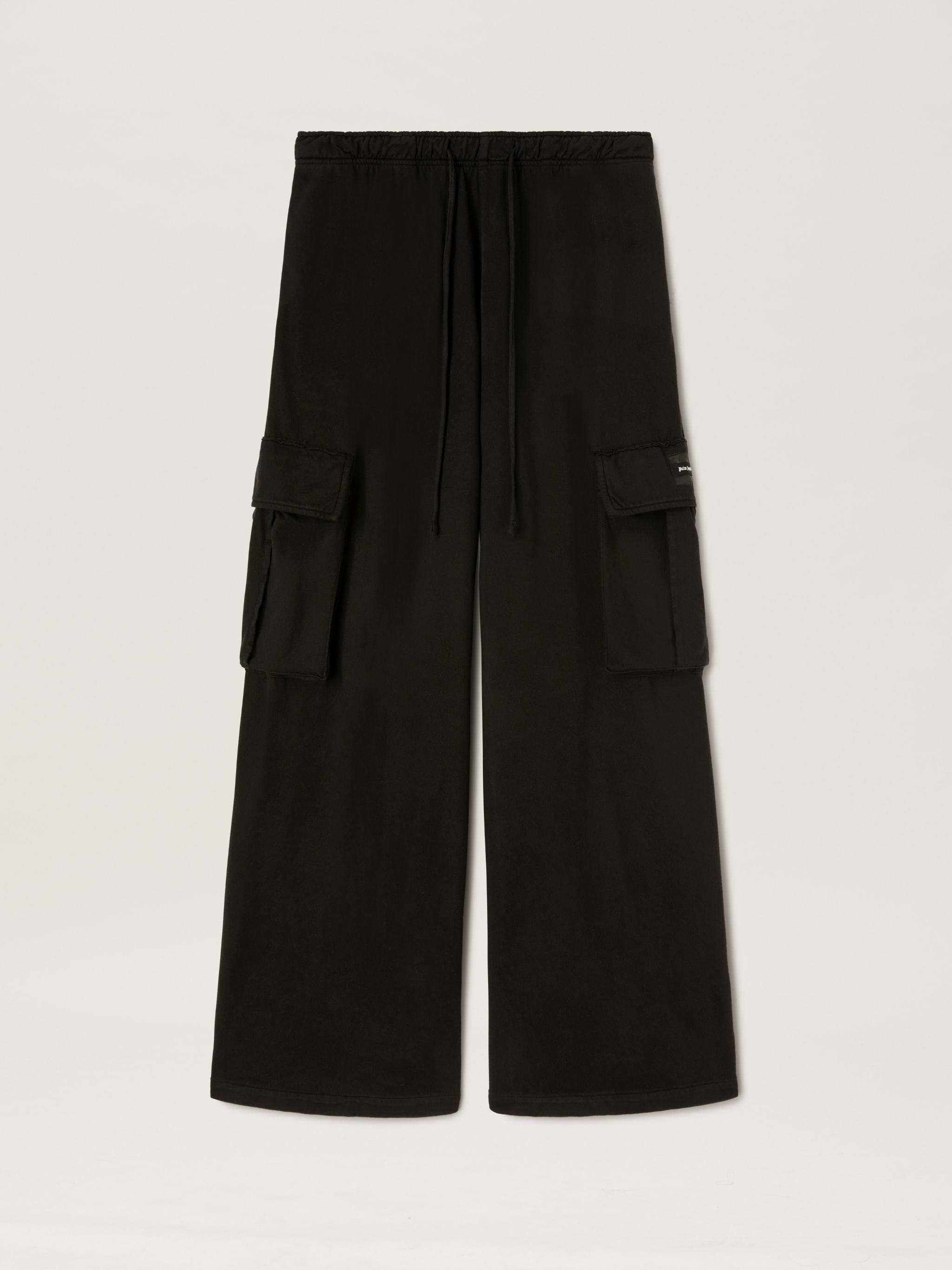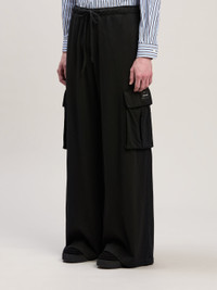 Utility wear accesses a dimension of comfort with tracksuit details and fabrics. Men's black cotton-jersey cargo pants with drawstring waist and gusseted pockets with Monogram embroidered in white on the flap. LORENZO WEARS SIZE 48 HEIGHT: 6' 2" (189 CM) BUST: 36" (92 CM) WAIST: 28" (71 CM) HIPS: 34"" (86 CM) PRODUCT ID: PMCF034F24FAB0011010