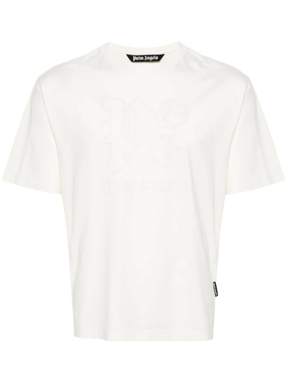 monogram-embroidered cotton T-shirt Palm Angels leans into its streetwear aesthetic with this white T-shirt. It’s crafted from cotton and accented with the brand's monogram on the front. Highlights - Off-white - Cotton - Jersey texture - Tonal stitching - Embroidered logo to the front - Crew neck - Short sleeves - Straight hem Made in Italy Composition Cotton 100%, Polyester 100% SIZE & FIT Model measurements Height 6 ft 2 in(1.87 m) Bust/Chest 36.22 in(92 cm) Hips 37 in(94 cm) Waist 27.95 in(71 cm)