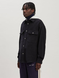 Elevating ease to new classic. Men's blue overshirt with collar and hood in gray fleece with Monogram embroidered in black, front pockets with flaps and buttons. PRODUCT ID: PMES021R24FAB0011005