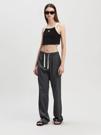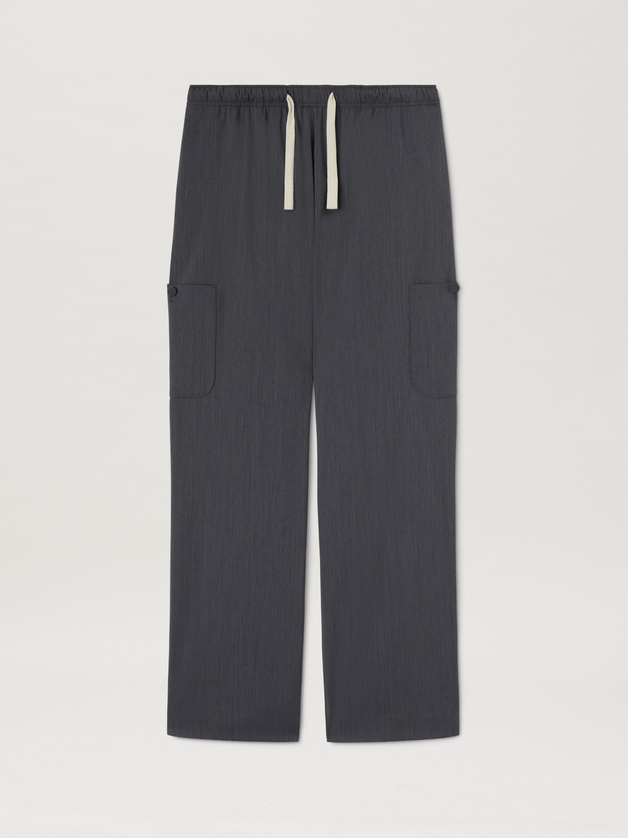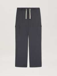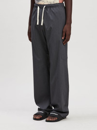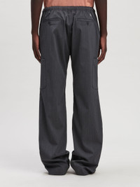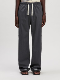 Utility aestethic with a leisure touch. Men's loose-fitting grey pants with elastic and drawstring waistband, double pockets on front and small pockets closed by button at back. EMBROIDERY 100% POLYESTER - FABRIC 2% ELASTAN 43% VIRGIN WOOL 55% POLYESTER Paolo wears size 48 Height: 6' 2" (188 cm) Bust: 34" (86 cm) Waist: 28" (72 cm) Hips: 36" (92 cm) PRODUCT ID: PMCA157R24FAB0010505