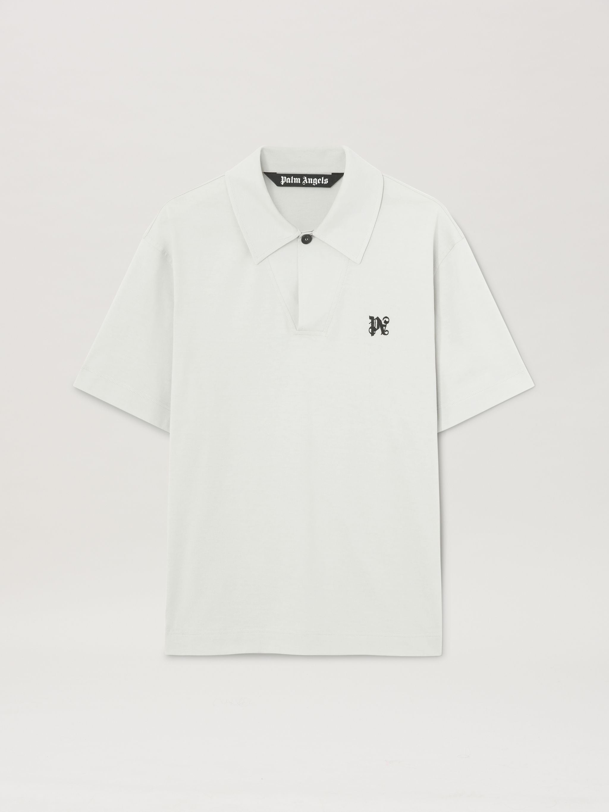 Light gray men's polo shirt with regular fit, short sleeves, Palm Angels Monogram outlines embroidered in black on the heart. FABRIC 100% COTTON EMBROIDERY 100% POLYESTER DETAIL 1 100% COTTON DETAIL 2 100% POLYESTER MODEL ISMAEL WEARS SIZE M HEIGHT: 6’2" (188 CM) CHEST: 38" (98 CM) WAIST: 30" (78 CM) HIPS: 37" (94 CM) PRODUCT ID: PMGB013E23JER0010510