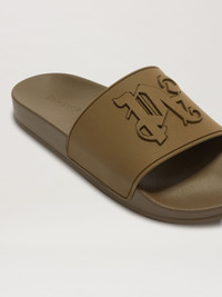 Pool slider in dark blue brown, with ergonomic footbed, wide band with engraved profiles and emossed Palm Angels Monogram. Sole with non-slip details. sole 100% POLYURETHANE upper shoe 100% POLIURETANO TERMOPLASTICO PRODUCT ID: PMIC010E23PLA0016262