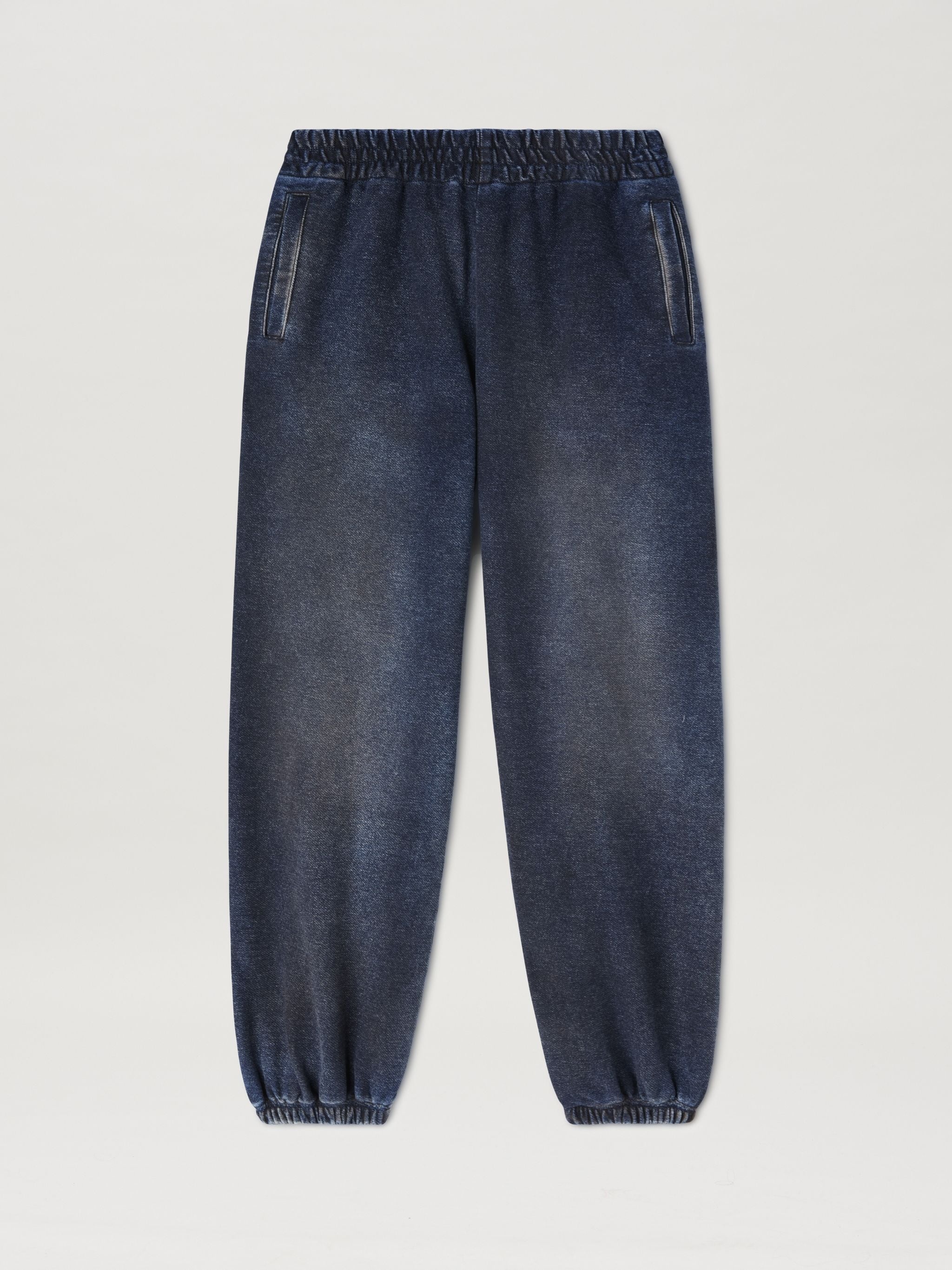 Fake jeans with sweat fabric to get a street attitude on a relaxed pant. Men's black delave denim-effect sweatpants, oversized fit, with elastic waist and ankles, and with Monogram in series hand-printed in shaded black on back. Paolo wears size M Height: 6' 2" (188 cm) Bust: 34" (86 cm) Waist: 28" (72 cm) Hips: 36" (92 cm) Ebba wears size 48 Height: 5' 10" (178 cm) Bust: 31" (79 cm) Waist: 23" (60 cm) Hips: 35" (89 cm) PRODUCT ID: PMCH026F24FAB0011010