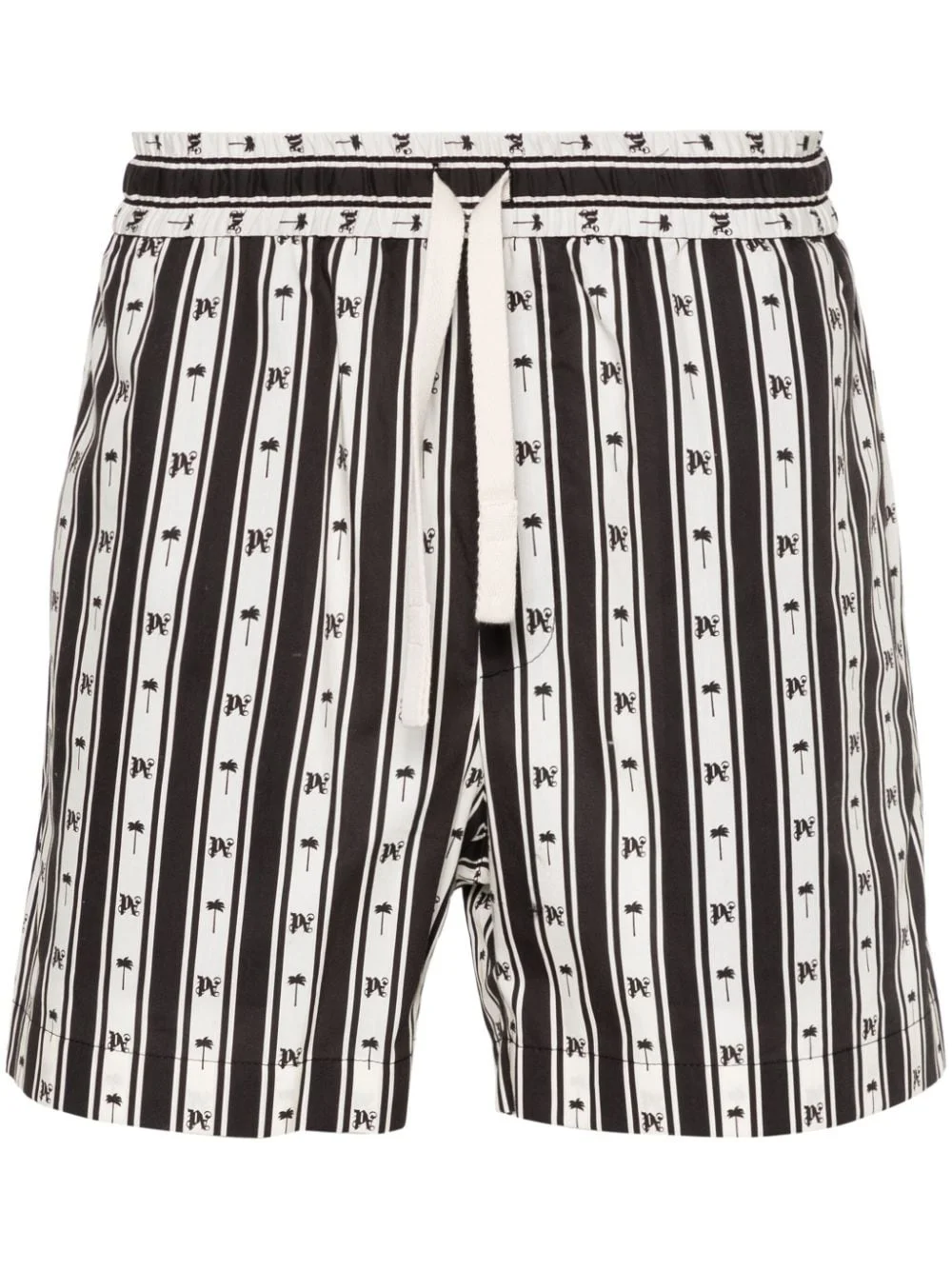 monogram-print striped shorts Boasting Palm Angels' effortlessly relaxed aesthetic, these shorts are adorned with a vertical stripe jacquard pattern in monochrome hues. Highlights - Ivory white/black - Cotton - Vertical stripe pattern - Palm tree print - Monogram print - Two side inset pockets - Thigh-length - Rear welt pocket - Unlined - Elasticated drawstring waistband Made in Italy Composition Lining: Cotton 100% Outer: Cotton 100% SIZE & FIT Model measurements Height 6 ft 1 in(1.85 m) Bust/Chest 36.22 in(92 cm) Hips 36.22 in(92 cm) Waist 27.55 in(70 cm) FittingInformation Designed for a straight-leg fit, offering an unrestricted and comfortable fit over the leg The elasticated waist allows for a comfortable fit Made from a lightweight non-stretch fabric This piece fits true to size – take your usual size Washing instructions Hand Wash