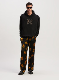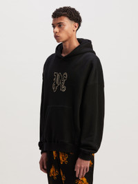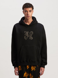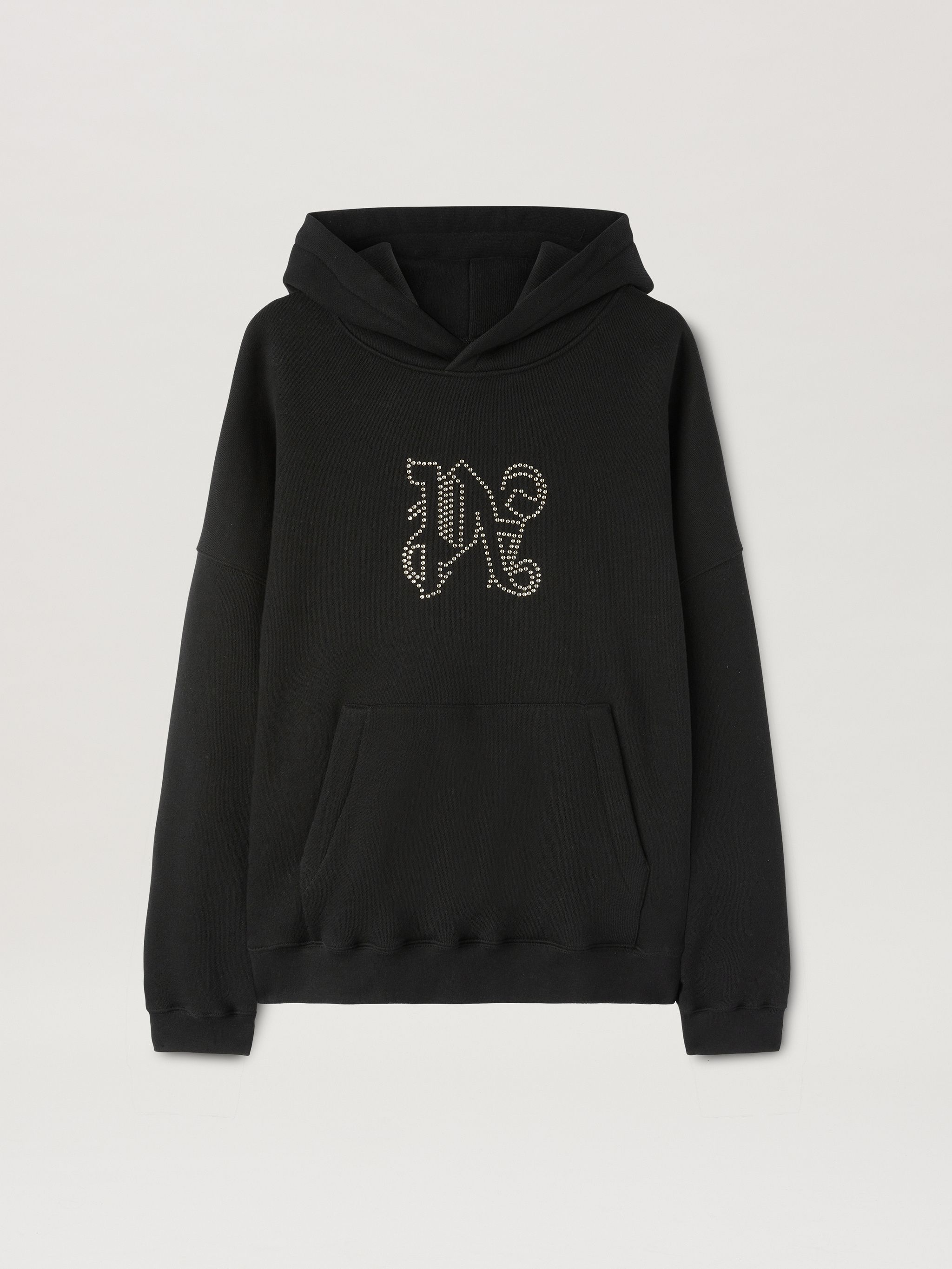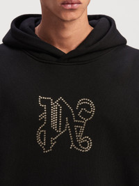 Emblems and images expressing a sense of identity. Men's black hoodie with front pouch pocket and Palm Angels Monogram embroidered with silver mini studs. Denzel wears size M Height: 6' 25" (190 cm) Bust: 36" (91 cm) Waist: 28" (72 cm) Hips: 35" (88 cm) PRODUCT ID: PMBB126R24FLE0081077