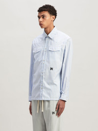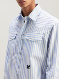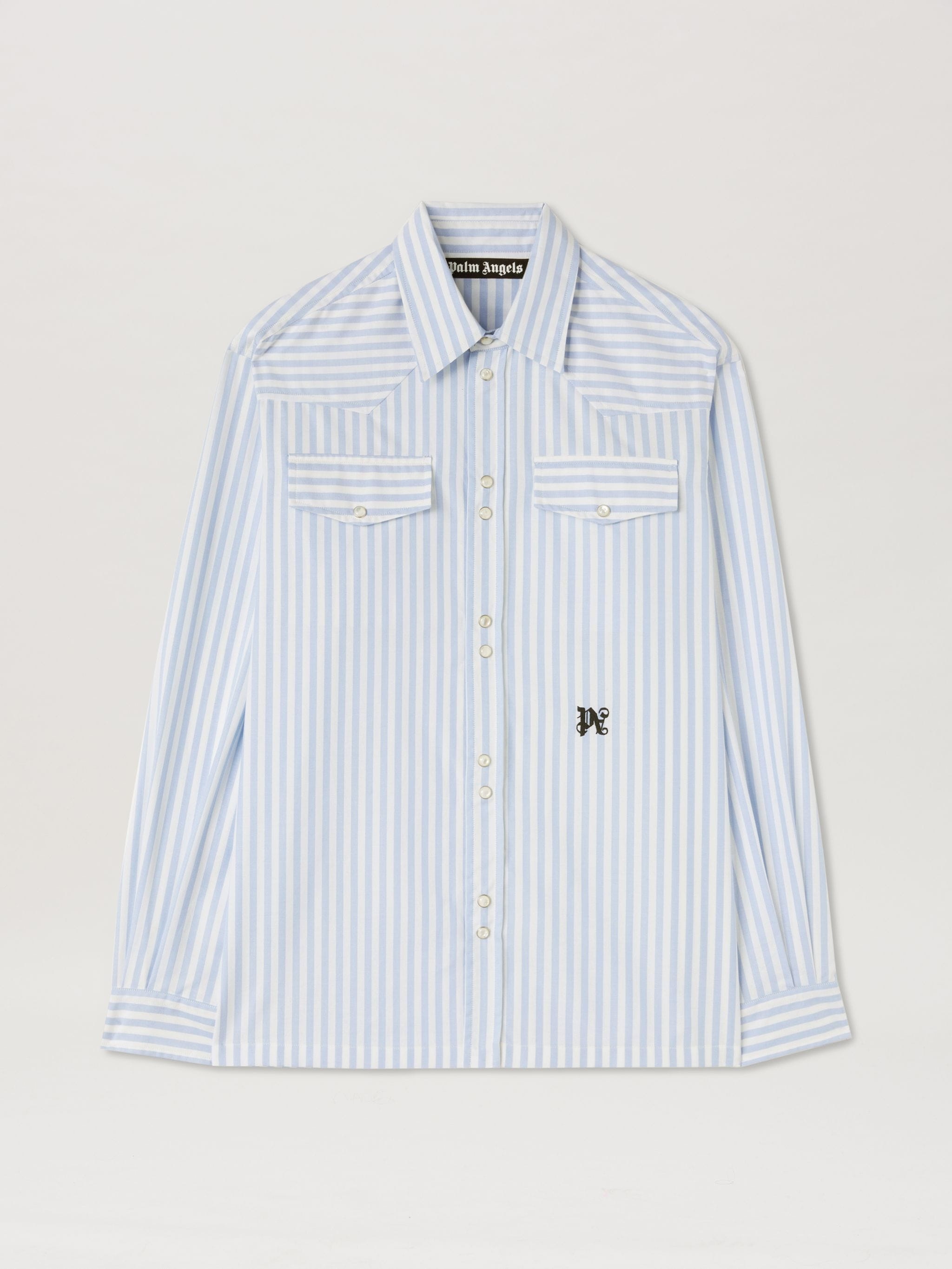 Variation on a classic. Light blue striped men's shirt with small collar, button placket with mother-of-pearl snaps, double breast pocket on front with button and Monogram embroidered in black on left. Denzel wears size 48 Height: 6' 25" (190 cm) Bust: 36" (91 cm) Waist: 28" (72 cm) Hips: 35" (88 cm) PRODUCT ID: PMGE028R24FAB0020340