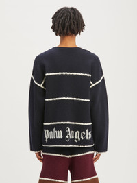 Men's navy blue regular fit crewneck knitwear sweater with white crochet stripes on the body, sleeves, cuff edges, white Palm Angels Monogram on the heart. FABRIC 80% WOOL 20% POLYAMIDE EMBROIDERY 100% POLYESTER DETAIL 44% VISCOSE 42% POLYAMIDE 14% WOOL Extrafine Merino MODEL ISMAEL WEARS SIZE M HEIGHT: 6’2" (188 CM) CHEST: 38" (98 CM) WAIST: 30" (78 CM) HIPS: 37" (94 CM) PRODUCT ID: PMHE048E23KNI0014603