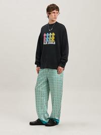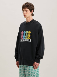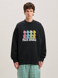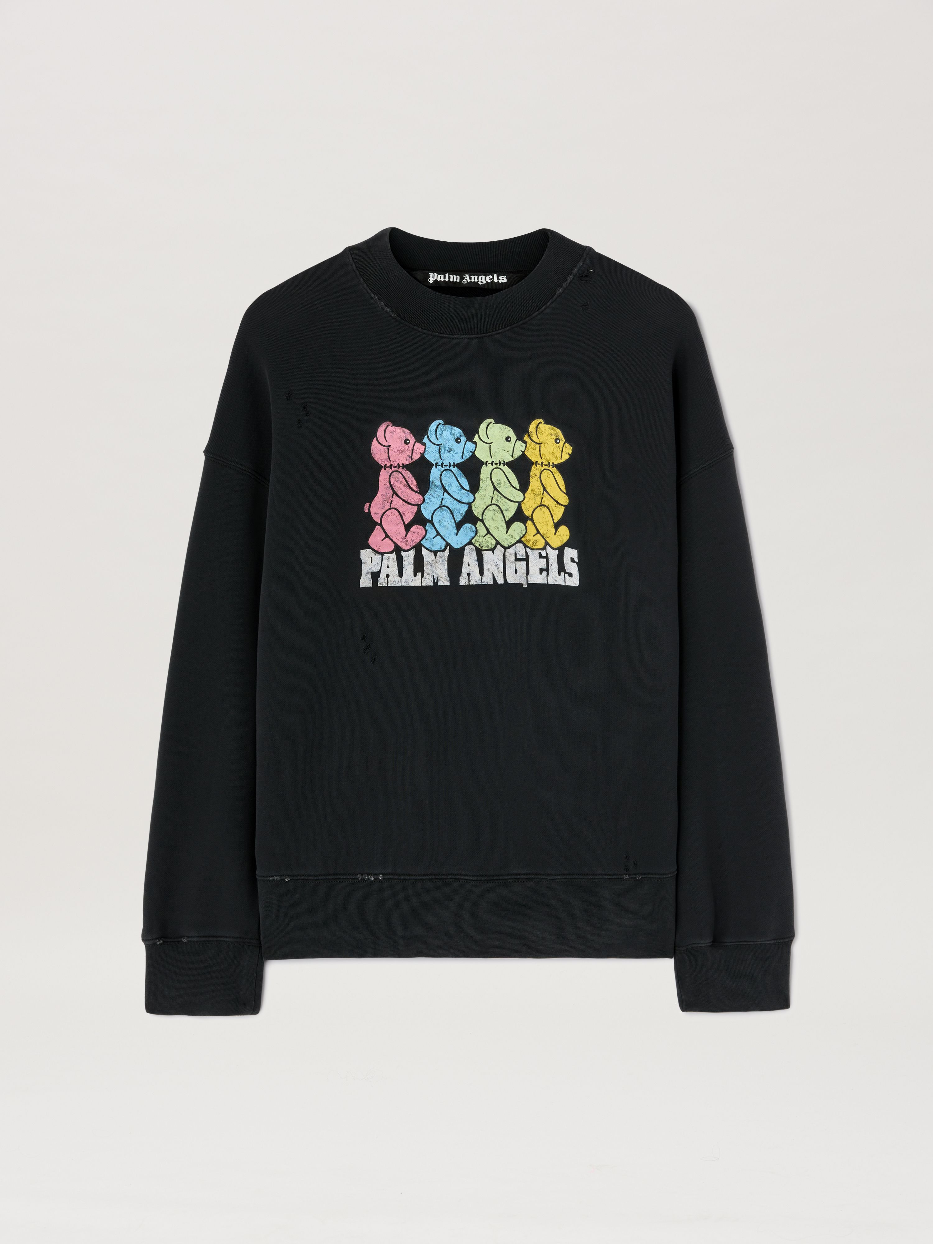 Iconic references, for a playful graphic involving one of Palm Angels' signature characters. Men's black crewneck sweatshirt with multicolored teddy bears crossing the road printed on the front and with logo Palm Angels underneath. MANUEL WEARS SIZE M HEIGHT: 6' 1” (185 CM) BUST: 34” (87 CM) WAIST: 26” (66 CM) HIPS: 33” (85 CM) PRODUCT ID: PMBA026S25FLE0041084