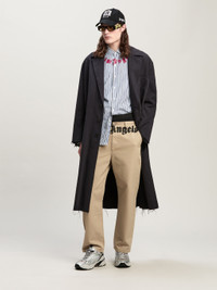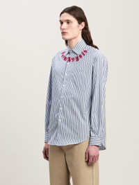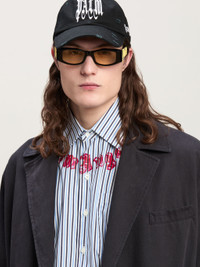 Logo augmented by new positioning and neon print effect. Men's striped shirt with long sleeves and front pocket, and marker fuchsia Palm Angels logo printed around the neck. FABRIC 100% COTTON LORENZO WEARS SIZE 48 HEIGHT: 6' 2" (189 CM) BUST: 36" (92 CM) WAIST: 28" (71 CM) HIPS: 34" (86 CM) PRODUCT ID: PMGE024F24FAB0014532
