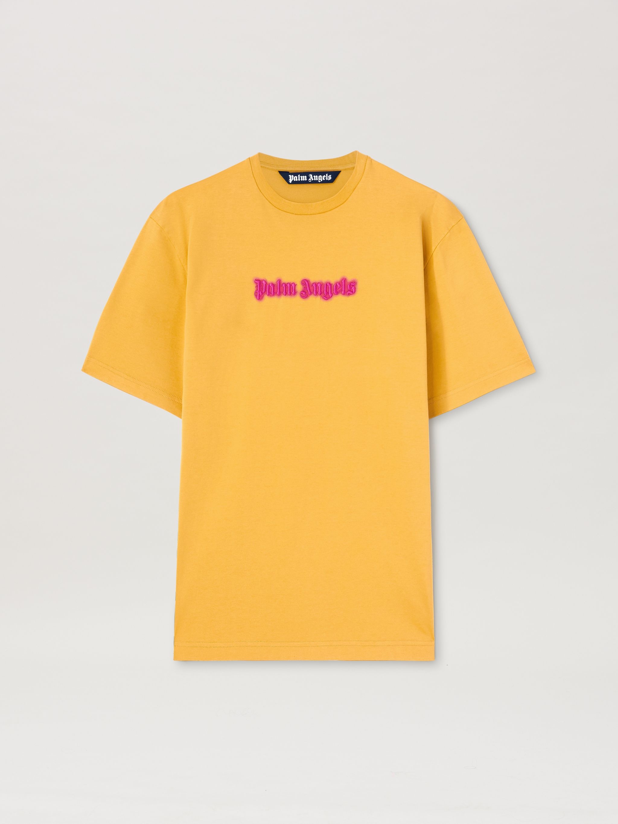 Logo variants with unique visual and tactile effects. Men's ocher yellow, slim-fit, T-shirt with fuchsia Palm Angels logo embroidered with neon effect print on front. Paolo wears size M Height: 6' 2" (188 cm) Bust: 34" (86 cm) Waist: 28" (72 cm) Hips: 36" (92 cm) Ebba wears size 48 Height: 5' 10" (178 cm) Bust: 31" (79 cm) Waist: 23" (60 cm) Hips: 35" (89 cm) PRODUCT ID: PMAA089F24JER0061632