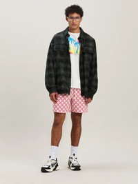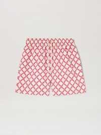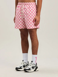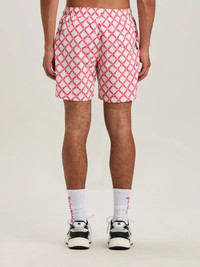 The new grid pattern of SS25 results by playing with the classic logo through repetition and crossing, Men's ivory-colored swimshorts with Net Logo patterm in fuchsia, elastic waist and drawstring and back pocket. SALAH WEARS SIZE M HEIGHT: 6' 0” (183 CM) BUST: 37.5” (95 CM) WAIST: 30” (76 CM) HIPS: 36” (91 CM) PRODUCT ID: PMFD012S25FAB0030B32