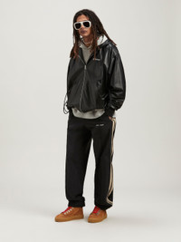 Men's black tracksuit pants with elastic waistband, side ecru bands with black thread in the center and, exclusive new feature for the fall winter 2023 collection, Palm Angels logo embroidered in white the front. FABRIC 1 100% POLYAMIDE FABRIC 2 59% POLYAMIDE 41% POLYESTER EMBROIDERY 100% POLYESTER MODEL MOHAMED WEARS SIZE M HEIGHT: 6’1" (185 CM) CHEST: 36" (92 CM) WAIST: 28" (73 CM) HIPS: 35" (89 CM) PRODUCT ID: PMCJ018F23FAB0011003