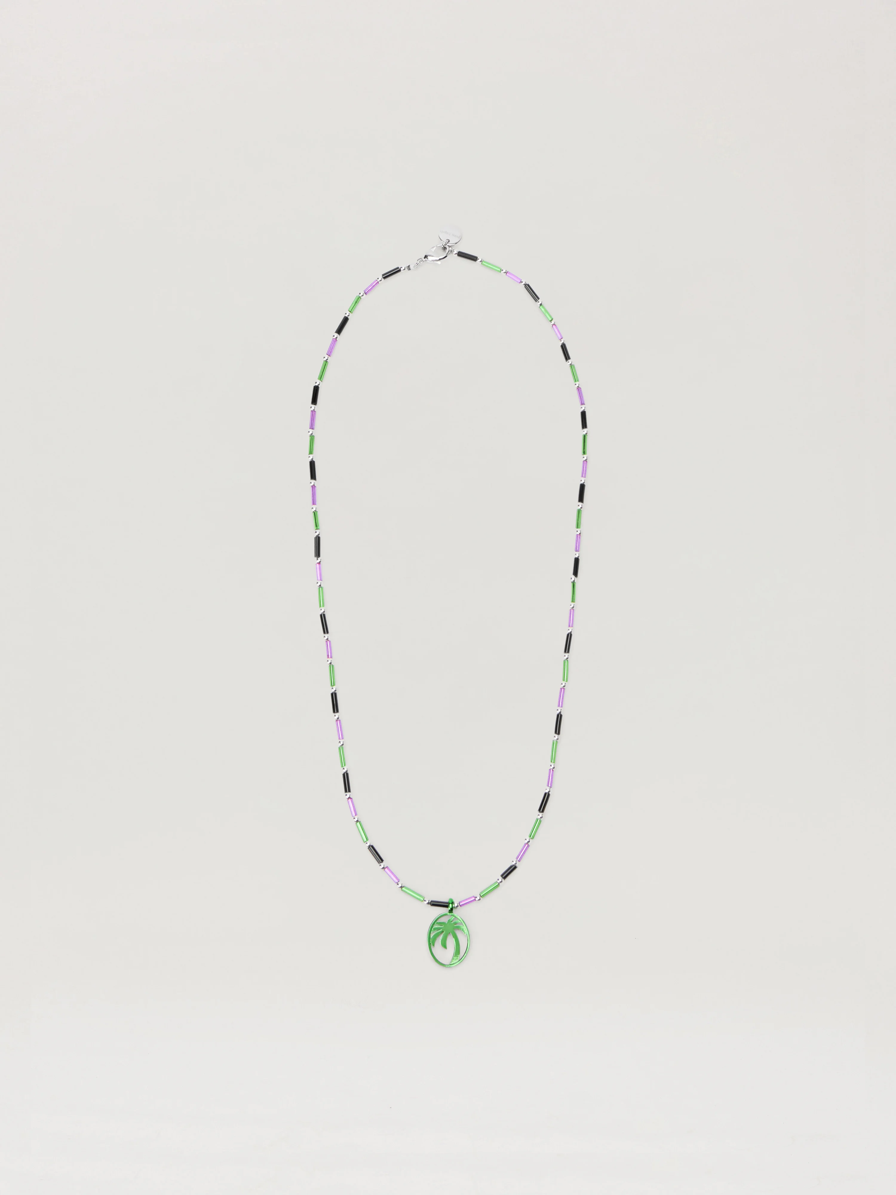 Exquisitely crafted necklace with multicolored beads and a distinctive palm motif pendant. - Features an intricate green palm motif pendant - Composed of multicolored tubular beads - Secure metal clasp fastening - Designed with an alternating bead pattern - Accented with silver-tone spacer beads - Versatile for layered styling DETAILS - 70% Brass 30% Glass - Code: PMOB12IF25MAT0015535