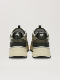 Instantly defining an attitude, blending comfort, style and a calling for a shared identity. Men's leather sneaker with technical fabric inserts, white cushioned high sole, white palm tree stitched on sides, tongue with black leather insert with beige logo and palm tree engraved, white tag with beige Monogram at bottom of lacing and black leather reinforcement with beige palm tree on back. PRODUCT ID: PMIA098S24LEA0010709