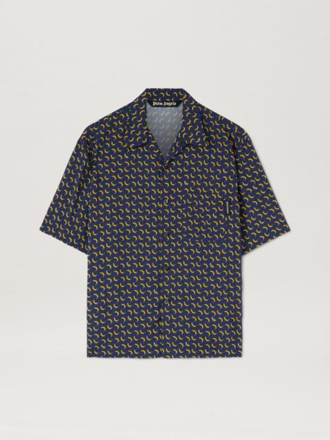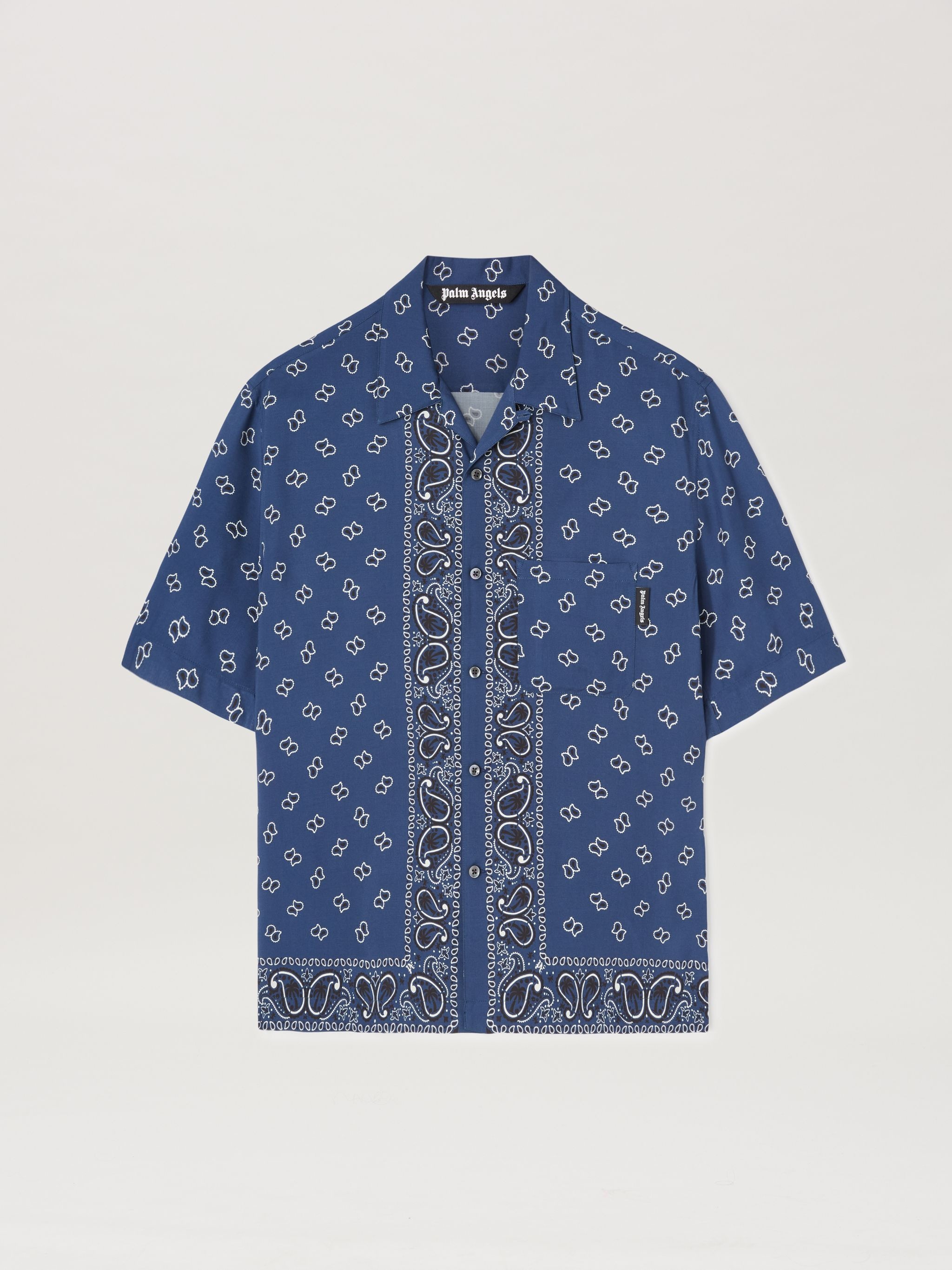 Witty little prints to brighten the new season. Men's blue short-sleeved shirt with micro paisley pattern and breast pocket, with lacing and hem edged with macro paisley pattern frame. PRODUCT ID: PMGG005S24FAB0064646