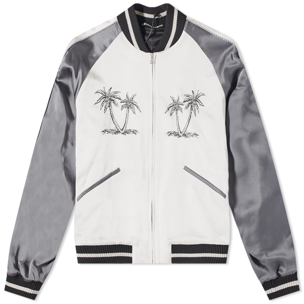 Palm Angels consistently draws influences from nostalgic American styles - and this varsity-style Souvenir jacket shows off just that. Cut to a classic boxy silhouette, it's coloured in white with contrasting silver sleeves in a durable acetate fabric. Accented with classic striped trims, it’s also detailed with palm trees on the chest - a nod to the label’s West Coast-inspired namesake. - 75% Acetate, 25% Viscose - Ribbed Trims - 2 Side Pockets - Zip Closure - Printed Branding - Made in Italy