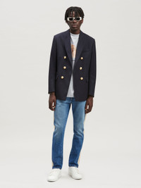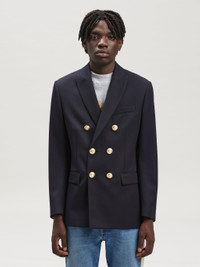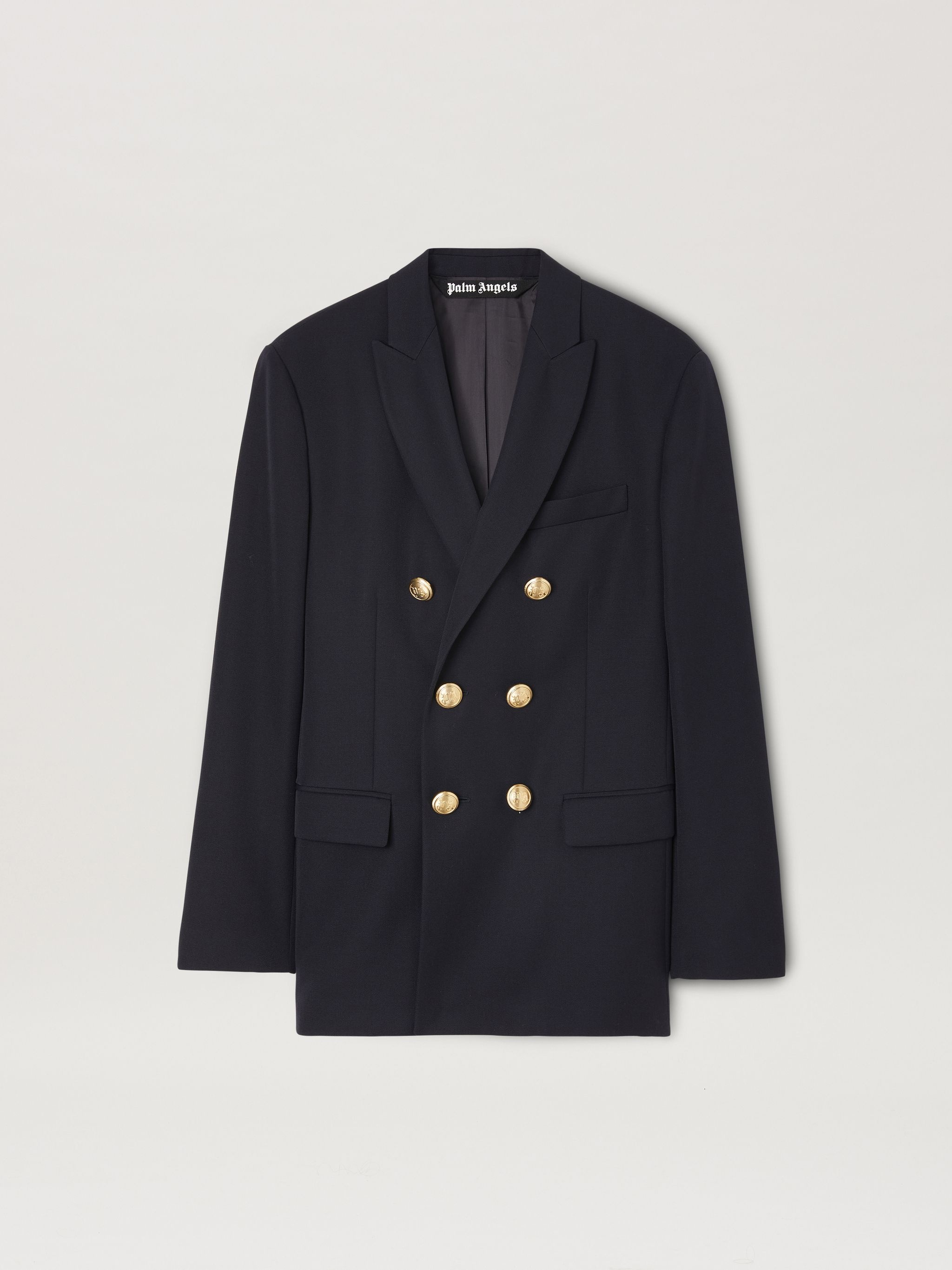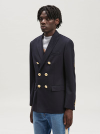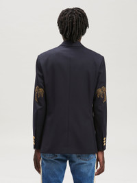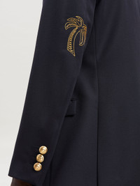 LONG SLEEVES DOUBLE BREASTED BLAZER IN NAVY BLUE WOOL. GOLDEN PALM LOGO EMBROIDERED ON THE ELBOWS. PEACKED LAPEL COLLAR. GOLDEN BUTTON CLOSURE AND FLAP POCKETS AT FRONT. BUTTON CLOSURE AT BARREL CUFFS. FABRIC 55% POLYESTER 45% VIRGIN WOOL - EMBROIDERY 100% POLYESTER - LINING 100% VISCOSE - LINING 2 100% COTTON MODEL PAOLO WEARS SIZE 48 HEIGHT: 6'2 (187 CM) CHEST: 32" (82 CM) WAIST: 27" (68 CM) HIPS: 36" (91 CM) PRODUCT ID: PMEN023C99FAB0014676