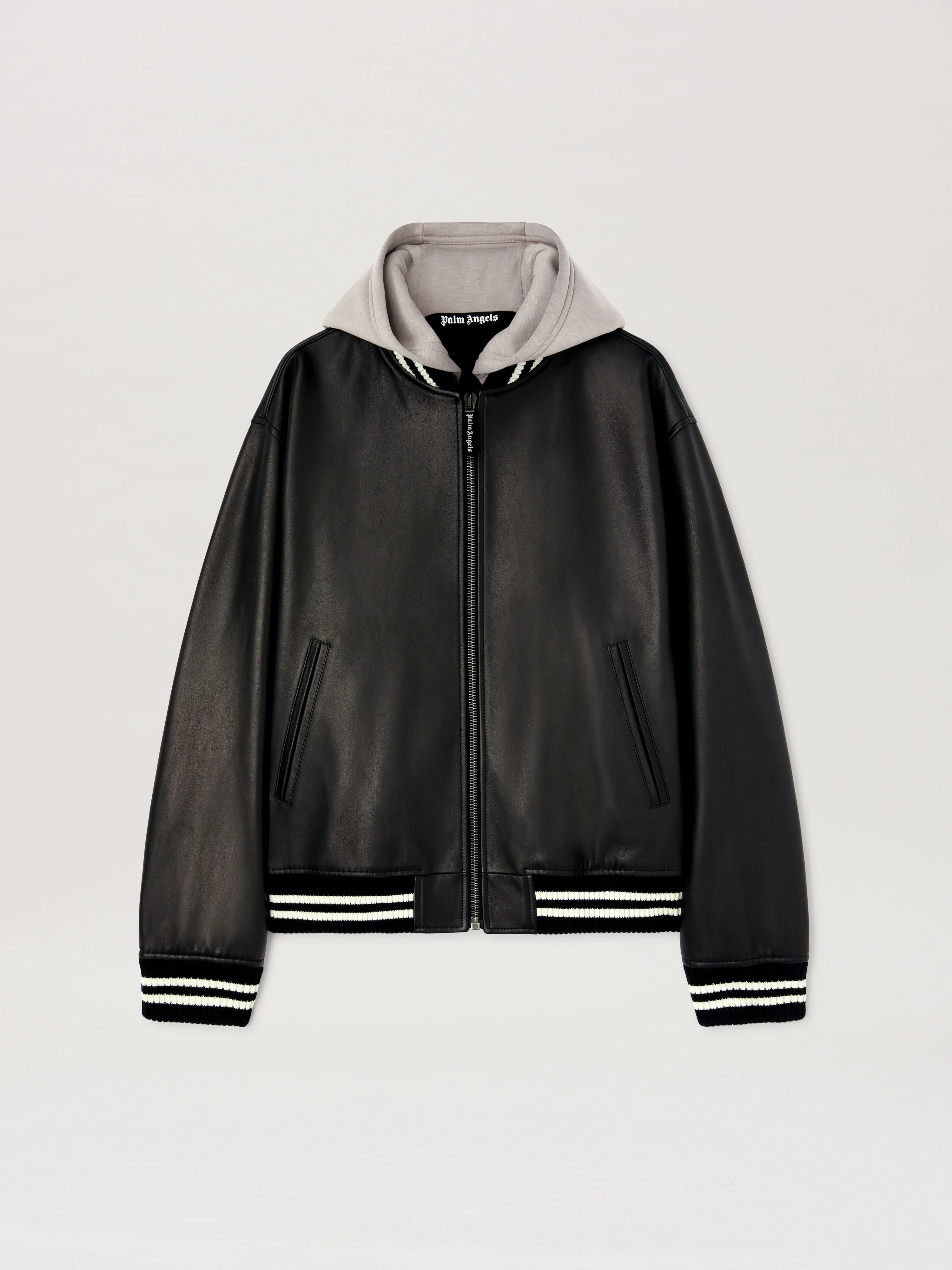 Utility blends with style and the icons of Palm Angels. Men's black leather bomber with ribbed and striped details, over fit and logo Curved printed in white on the back. SALAH WEARS SIZE 48 HEIGHT: 6' 0” (183 CM) BUST: 37.5” (95 CM) WAIST: 30” (76 CM) HIPS: 36” (91 CM) PRODUCT ID: PMJA043S25LEA0011003