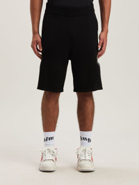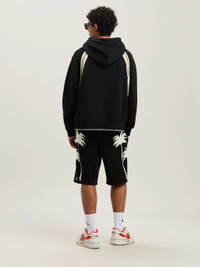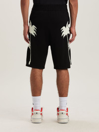 The palm tree, one of the brand's identifying elements, takes center stage for SS25 with new prints, inlays and shapes. Men's black knit shorts with elastic waist and white palm trees inlay on both legs. SALAH WEARS SIZE M HEIGHT: 6' 0” (183 CM) BUST: 37.5” (95 CM) WAIST: 30” (76 CM) HIPS: 36” (91 CM) PRODUCT ID: PMHM012S25KNI0021003