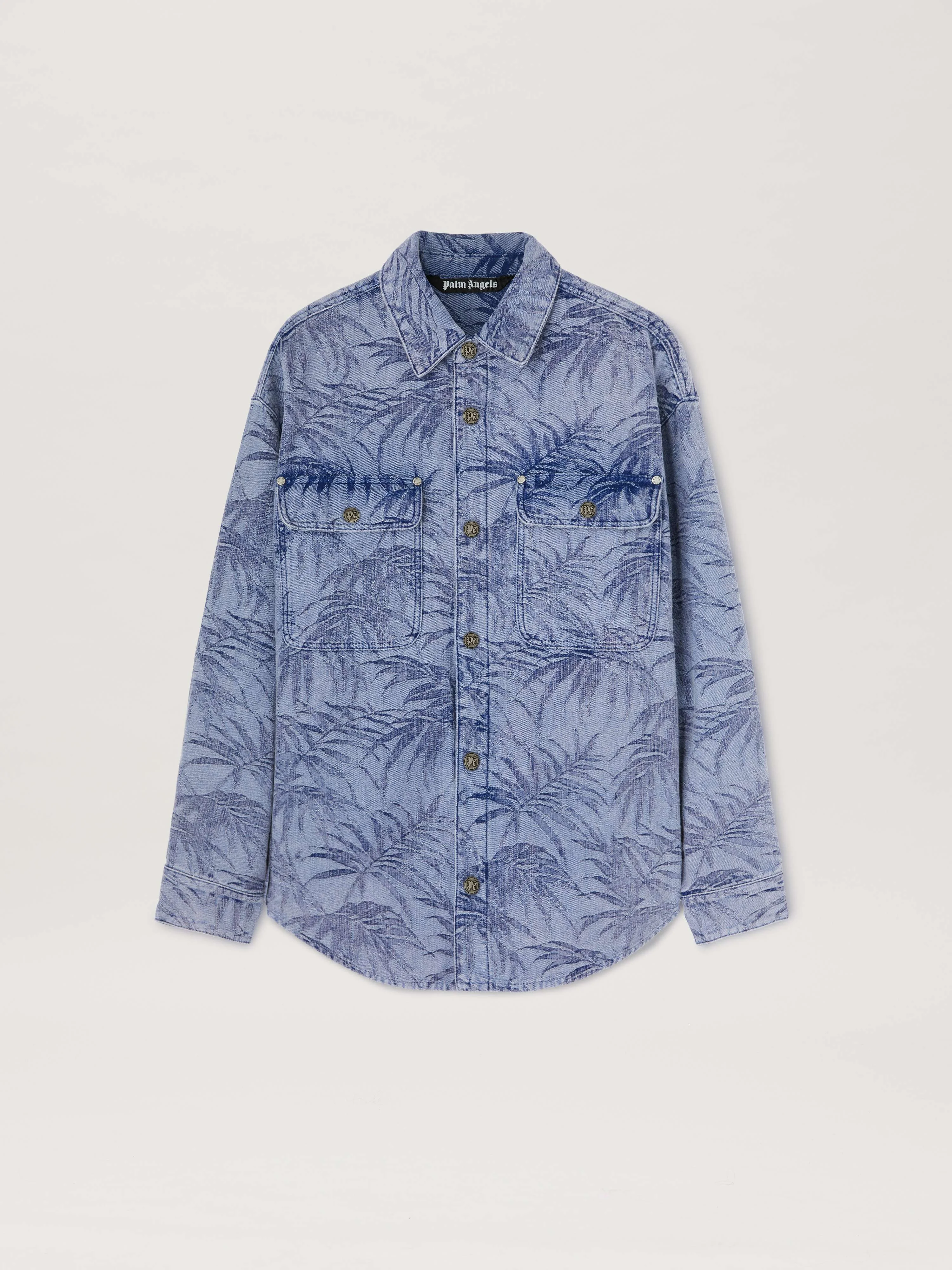Embrace the palm tree motif in a relaxed style. Men's garment-dyed blue denim shirt with snap button closure and flap pockets on the front featuring an all-over jacquared palm motif. DETAILS - Manuel Wears Size M Height: 6' 1” (185 Cm) Bust: 34.5” (87 Cm) Waist: 26” (66 Cm) Hips: 33” (85 Cm) Fabric 40% Polyester 60% Cotton - Code: PMYD024S25DEN0014040