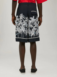 SHORT PANTS IN BLACK WITH PALM TREES PRINTED ALL OVER IN WHITE. TWO-POCKET ON SIDE AND ONE FLAP POCKET AT BACK. WHITE TRIM DETAIL. FABRIC 100% SILK MODEL MASSAER WEARS SIZE 48 HEIGHT: 6'1 (185 CM) CHEST: 31" (80 CM) WAIST: 24" (62 CM) HIPS: 34" (86 CM) PRODUCT ID: PMCB038S22FAB0031003