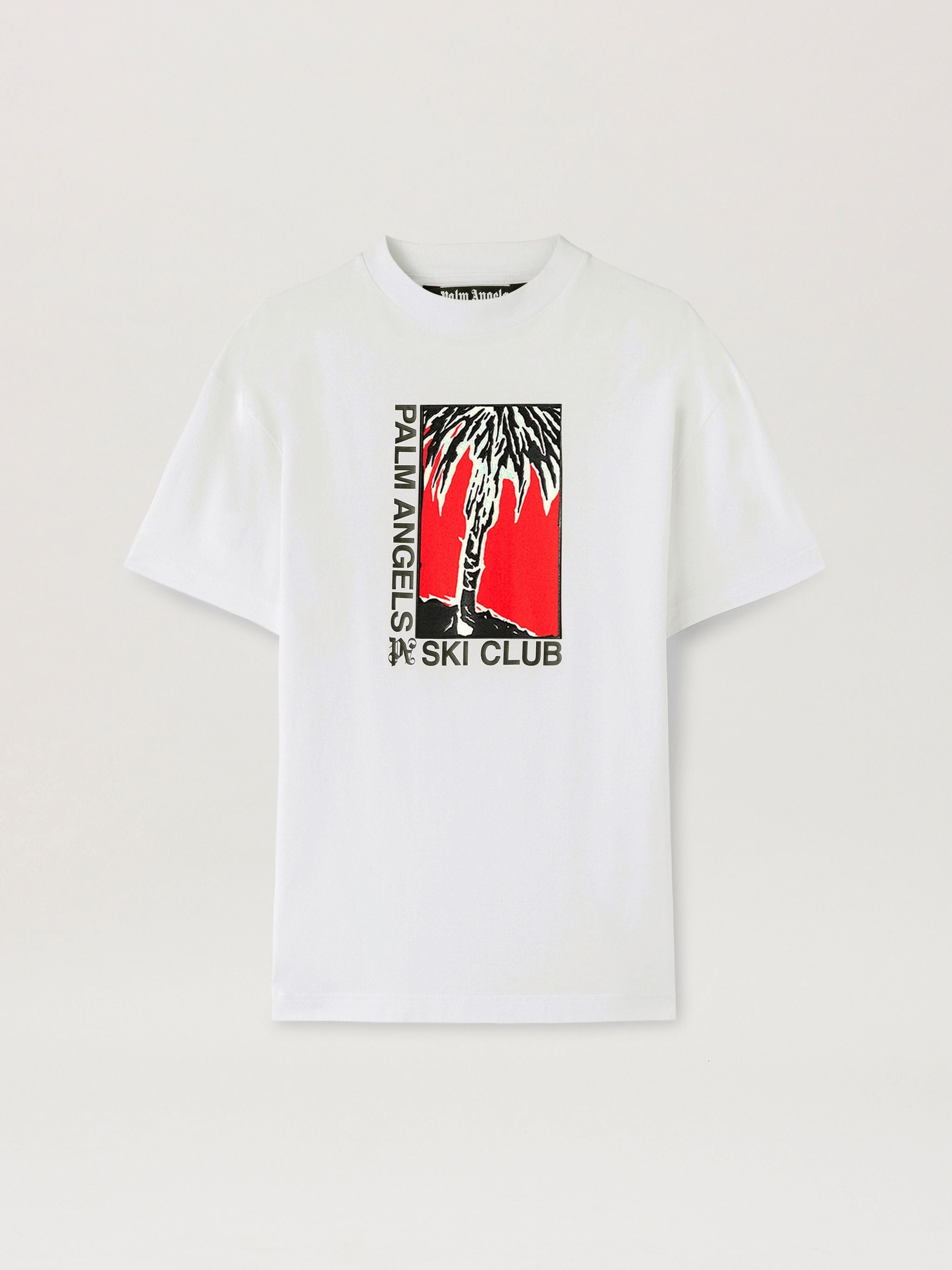 Après-ski vibes. Men's white short-sleeved T-shirt, featuring central black palm tree print on red background on front and Palm Angels Ski Club and Monogram lettering in black. On the back, small lettering printed in black in the center. Special Collection Palm Angels Ski Club. Denzel wears size M Height: 6' 25" (190 cm) Bust: 36" (91 cm) Waist: 28" (72 cm) Hips: 35" (88 cm) PRODUCT ID: PMAA001R24JER0030110