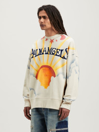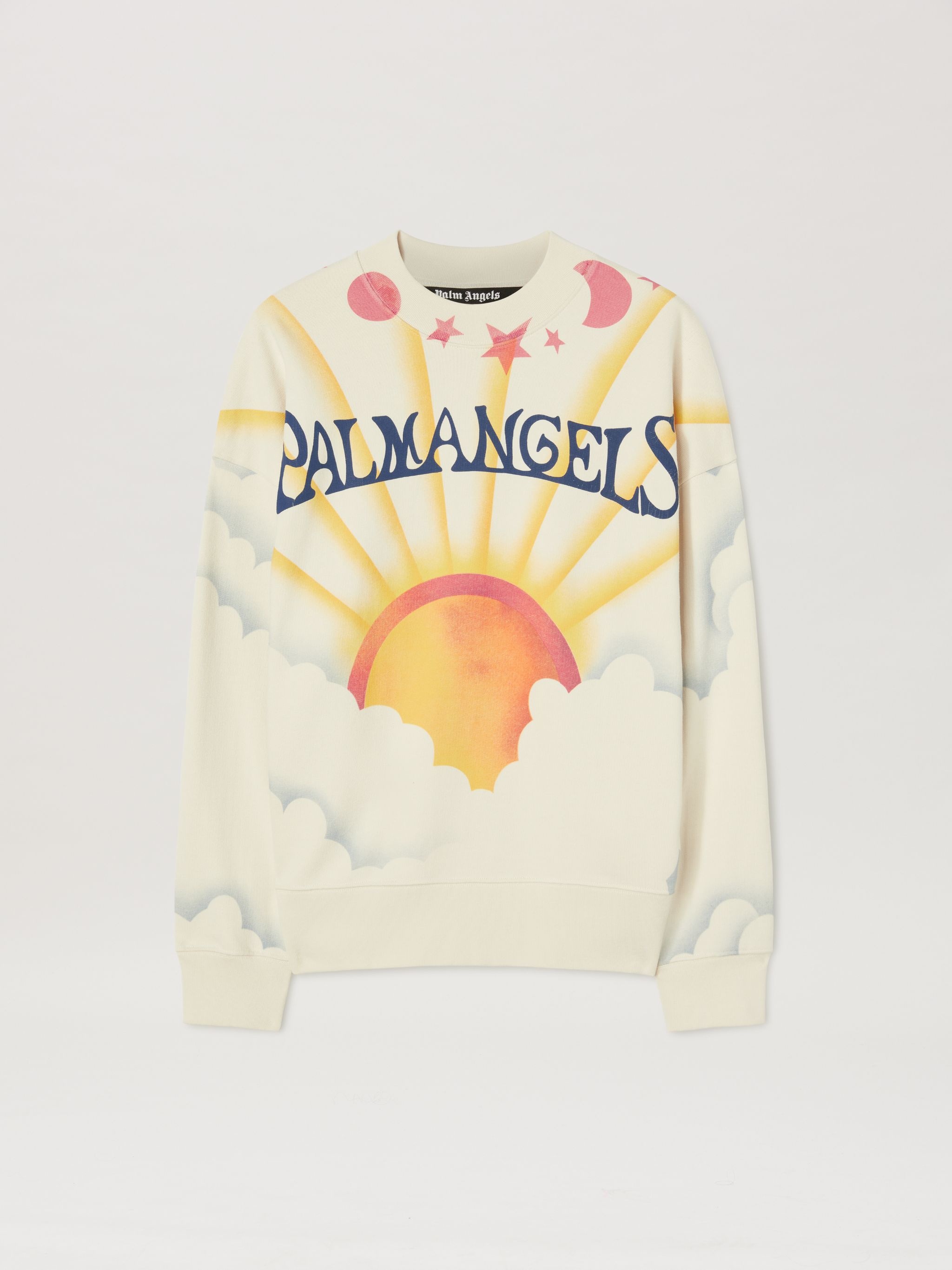 Men's white crewneck sweatshirt with "Sunrise pierces the clouds" print, pattern of celestial bodies in pink around the neck and Palm Angels lettering in blue. FABRIC 100% COTTON MODEL MOHAMED WEARS SIZE M HEIGHT: 6’1" (185 CM) CHEST: 36" (92 CM) WAIST: 28" (73 CM) HIPS: 35" (89 CM) PRODUCT ID: PMBA065F23FLE0020384