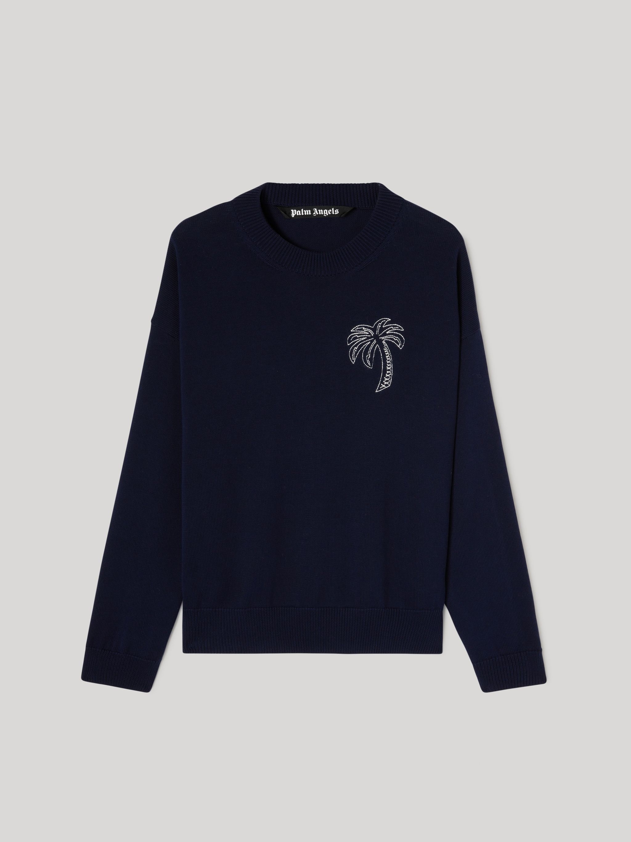 LONG SLEEVES BLUE SWEATER WITH WHITE PALM LOGO EMBROIDERED ON CHEST. CREWNECK COLLAR. FABRIC 100% COTTON MODEL MASSAER WEARS SIZE M HEIGHT: 6'1 (185 CM) CHEST: 31" (80 CM) WAIST: 24" (62 CM) HIPS: 34" (86 CM) PRODUCT ID: PMHE030S22KNI0041001