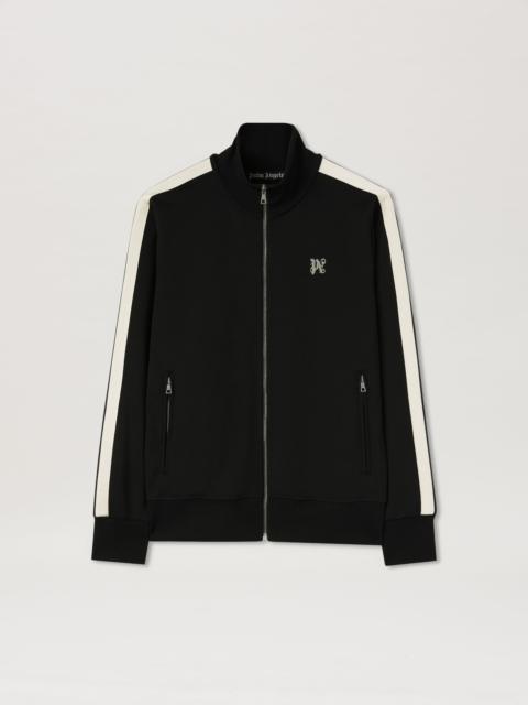 A new take on an identity garment. Men's tracksuit jacket in a special printed pattern of white palm trees on a light blue background, with contrasting white collar, cuffs and hem, ecru bands on sleeves, vertical zipper and zipper pockets. Paolo wears size M Height: 6' 2" (188 cm) Bust: 34" (86 cm) Waist: 28" (72 cm) Hips: 36" (92 cm) PRODUCT ID: PMBD058R24FAB0024003