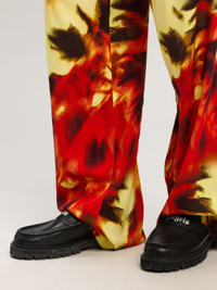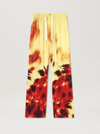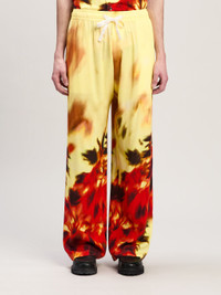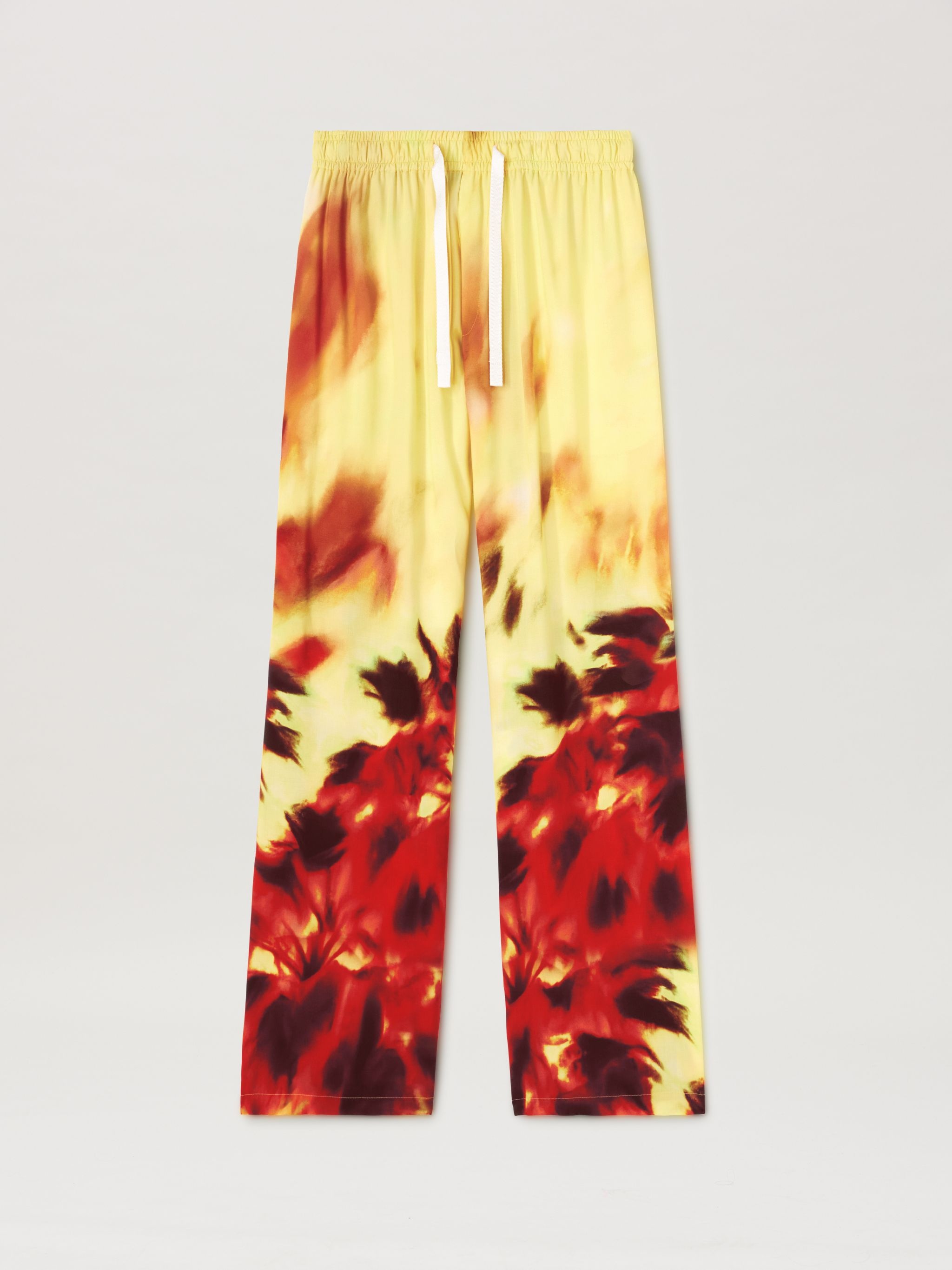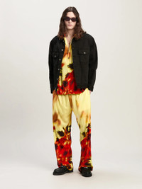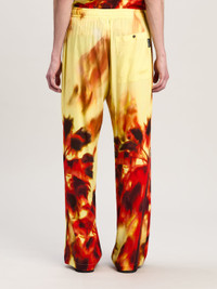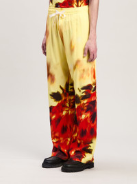 Leisure wear upgraded by a sophisticated and unique pattern. Men's loose fit light yellow pants with elastic waistband and white drawstring and with burning palms in red and black spread from bottom up. LORENZO WEARS SIZE 48 HEIGHT: 6' 2" (189 CM) BUST: 36" (92 CM) WAIST: 28" (71 CM) HIPS: 34"" (86 CM) PRODUCT ID: PMCA169F24FAB0011825