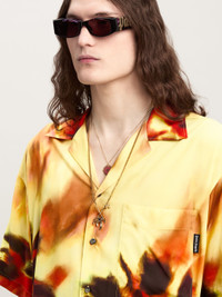 Leisure wear upgraded by a sophisticated and unique pattern. Men's light yellow Bowling style shirt with open collar and short sleeves, and palm tree in flames pattern in red on the bottom and on the beaks of the shirt. LORENZO WEARS SIZE 48 HEIGHT: 6' 2" (189 CM) BUST: 36" (92 CM) WAIST: 28" (71 CM) HIPS: 34"" (86 CM) PRODUCT ID: PMGG007F24FAB0021825