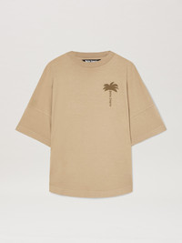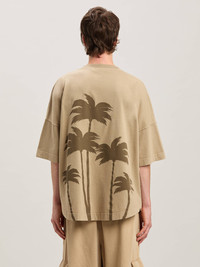 Palm trees blossom in a diversity of styles in the SS25. Men's beige oversize T-shirt with dyed effect featuring tonal Palm logo printed on front and palm tree pattern printed on back. DETAILS - Manuel Wears Size M Height: 6' 1" (185 Cm) Bust: 34" (87 Cm) Waist: 26" (66 Cm) Hips: 33" (85 Cm) Fabric 100% CottonRib Detail 100% Cotton - Code: PMAA002S25JER0046161