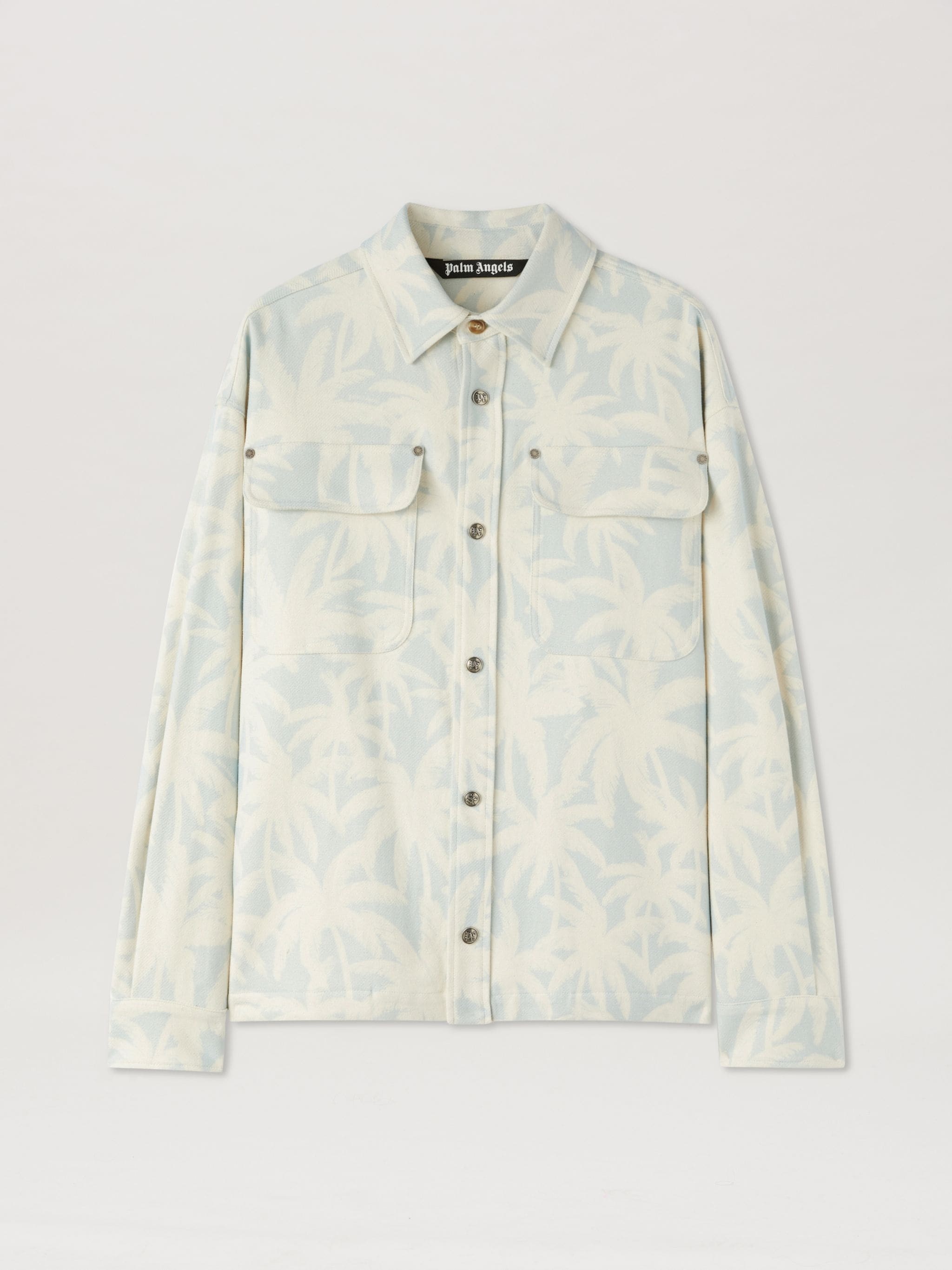Elevating ease to new classic. Men's over shirt with white palm tree print on light blue background, Monogram embossed button closure and flap patch pockets fastened with rivets. Denzel wears size 48 Height: 6' 25" (190 cm) Bust: 36" (91 cm) Waist: 28" (72 cm) Hips: 35" (88 cm) PRODUCT ID: PMES024R24FAB0024003