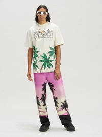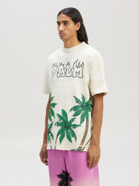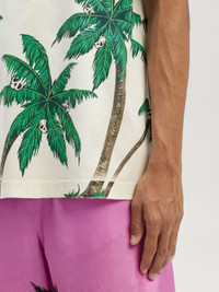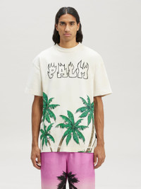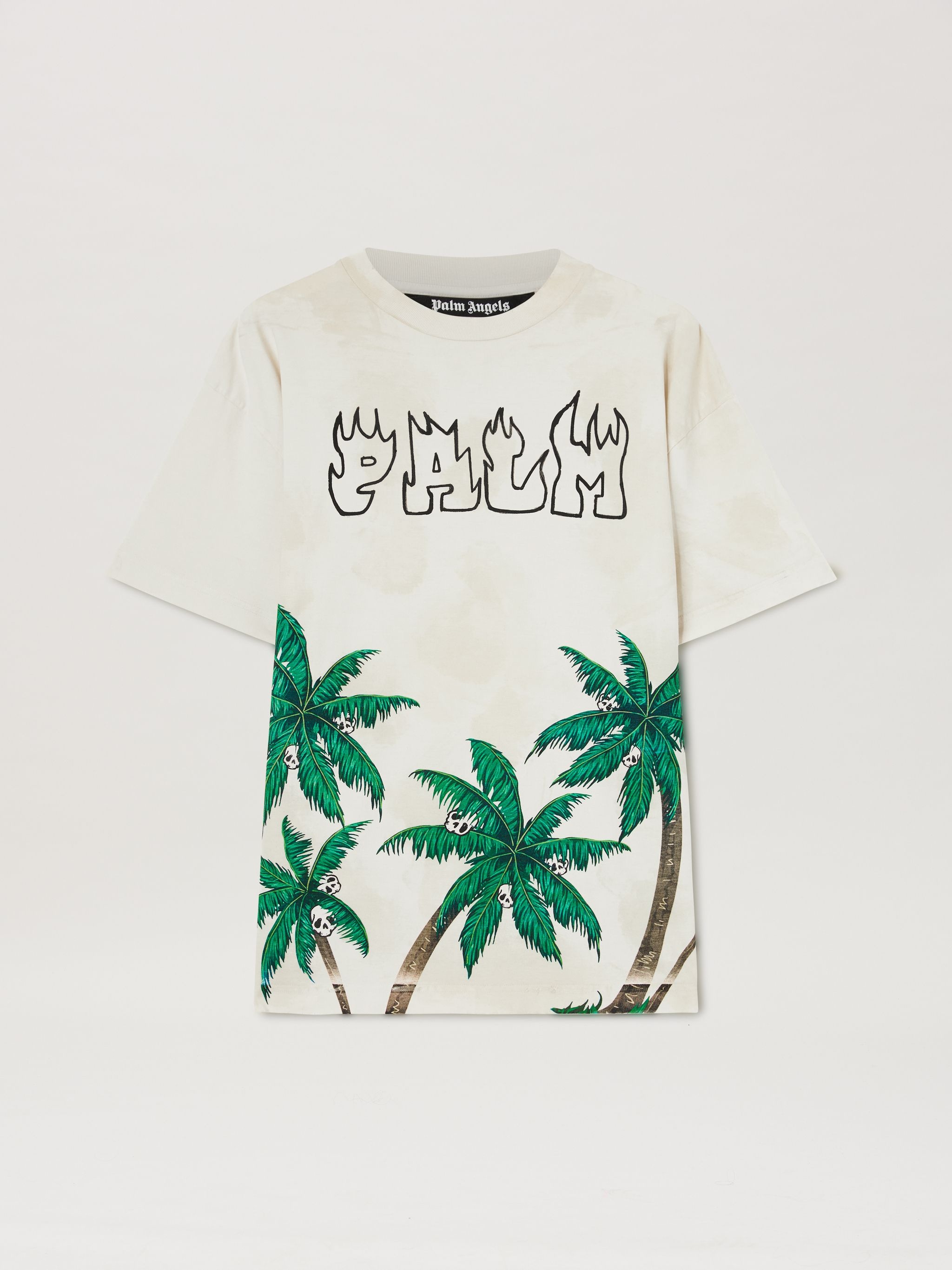 SHORT SLEEVES T-SHIRT IN WHITE COTTON JERSEY WITH PALMS AND SKULLS PRINTED AT FRONT AND TO THE REAR. BLACK "PALM ANGELS" LOGO PRINTED AT FRONT AND AT BACK. DROP SHOULDERS. CREWNECK COLLAR. FABRIC 100% COTTON MODEL KEVIN WEARS SIZE M HEIGHT: 6’1" (185 CM) CHEST: 36” (92 CM) WAIST: 28” (72 CM) HIPS: 36” (91 CM) PRODUCT ID: PMAA072S23JER0050155