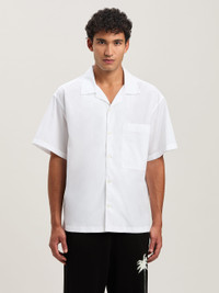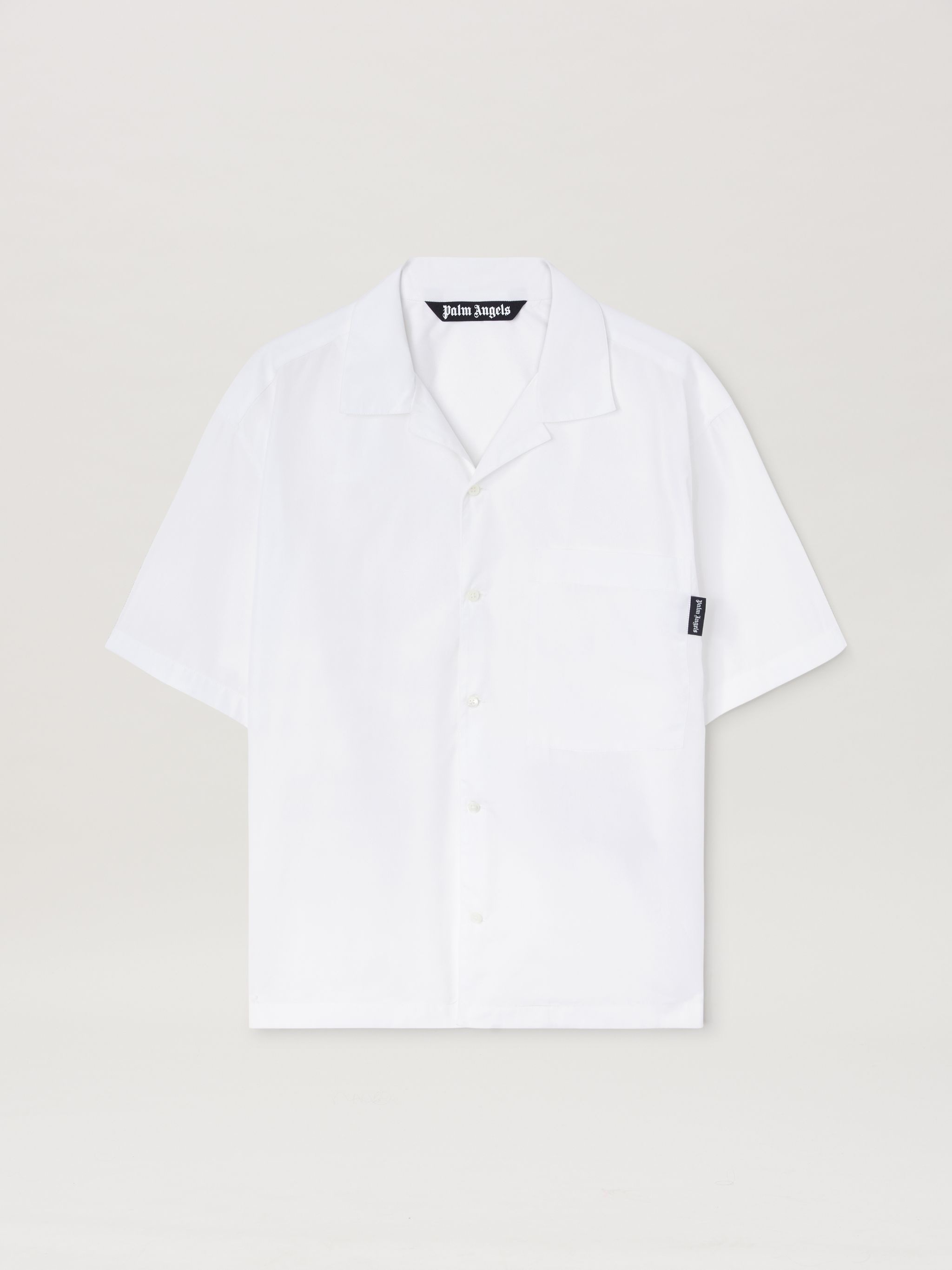 Logo mutations that turn a timeless icon into a new seasonal graphic. Men's white short-sleeved shirt with open collar, front breast pocket and Curved logo printed in black on back, at the bottom. SALAH WEARS SIZE 48 HEIGHT: 6' 0” (183 CM) BUST: 37.5” (95 CM) WAIST: 30” (76 CM) HIPS: 36” (91 CM) PRODUCT ID: PMGG00AS25FAB0040110