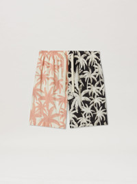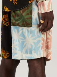 Easy design brightened up by lively prints. Men's short pants with white elastic and drawstring waistband, back flap pocket, featuring mix of prints: pink palm trees on white background, white palm trees on light blue background, white palm trees on black background, milestone green palm trees on brown background, and Monogram Burning pattern with golden flames on black background. Paolo wears size 48 Height: 6' 2" (188 cm) Bust: 34" (86 cm) Waist: 28" (72 cm) Hips: 36" (92 cm) PRODUCT ID: PMCB051R24FAB0018484