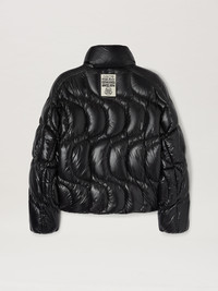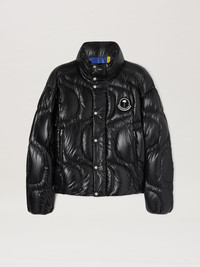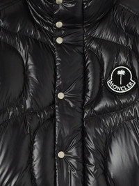 Black lacquered nylon down jacket with wave stitching, black terry patch with palm tree and white Moncler logo on front and graphic white patch on back. Metallic zipper and snap closure. PRODUCT ID: PMEJ006T25FAB0011010