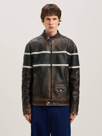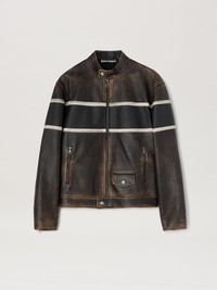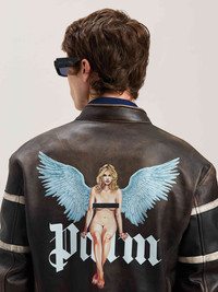 An original and unique print inspired by vintage pin ups, hybridized with elements from the world of Palm Angels. Men's vintage leather brown Biker jacket with black stripe and white piping on front and with pin up with angel wings printed on back with hand finishing. DETAILS - Lining 1 100% CuproLining 2 100% CottonMaterial 1 100% Leather - Code: PMJG018S25LEA0016003