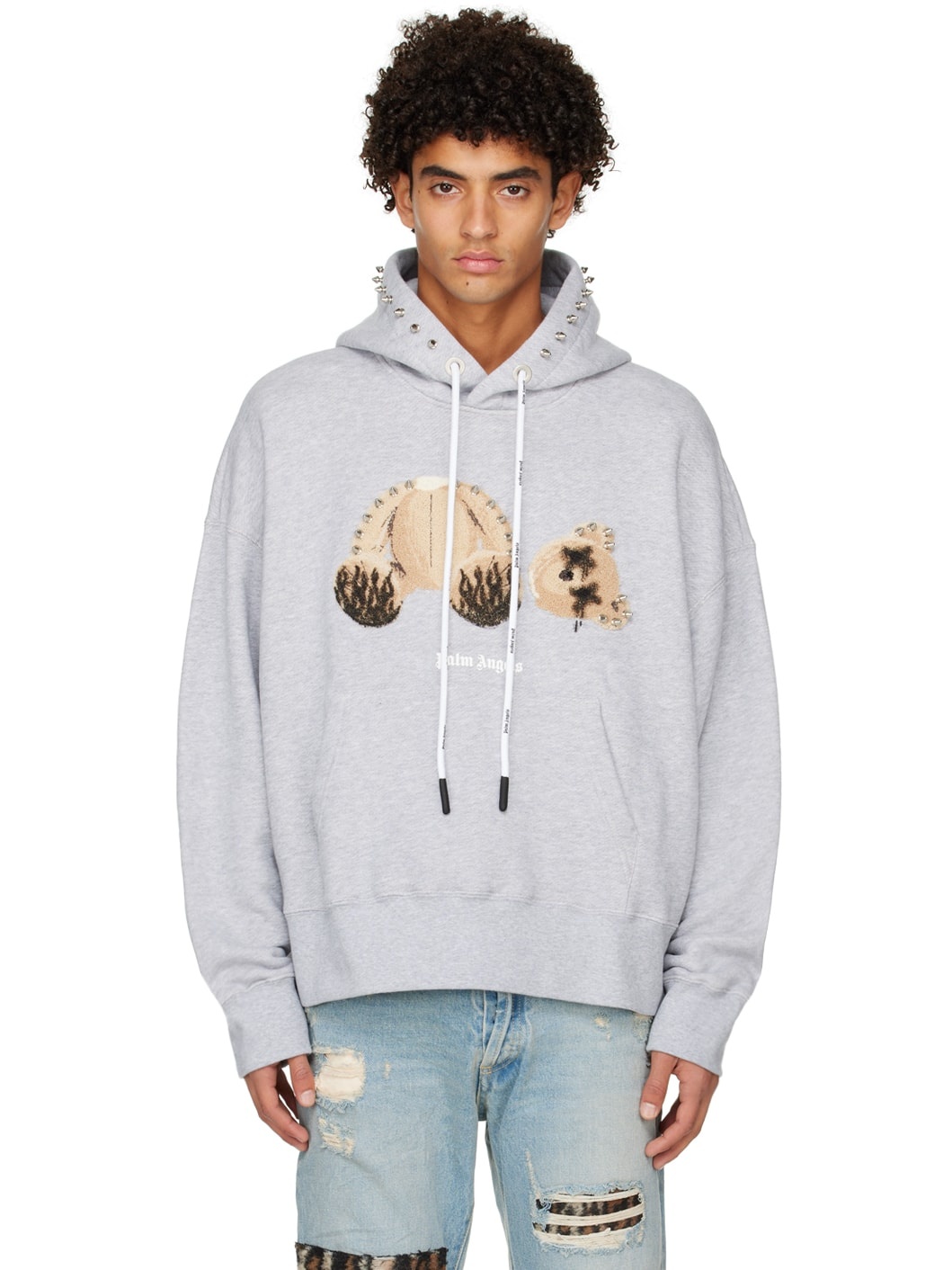 French terry hoodie. · Drawstring at hood · Studs at hood and front · Bouclé embroidered graphic at front · Kangaroo pocket · Rib knit hem and cuffs Supplier color: Melange grey Body: 100% cotton. Trim 1: 97% cotton, 3% elastane. Trim 2: 45% wool, 45% acrylic, 5% polyester, 5% cotton.