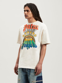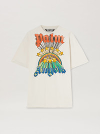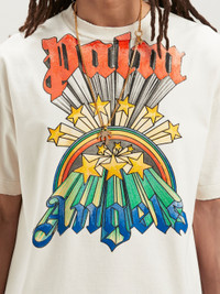 Men's white short-sleeved T-shirt with regular fit and used details, with print of rainbow and stars turning into Palm Angels logo in red and blue. FABRIC 100% COTTON MODEL MOHAMED WEARS SIZE M HEIGHT: 6’1" (185 CM) CHEST: 36" (92 CM) WAIST: 28" (73 CM) HIPS: 35" (89 CM) PRODUCT ID: PMAA072F23JER0050384