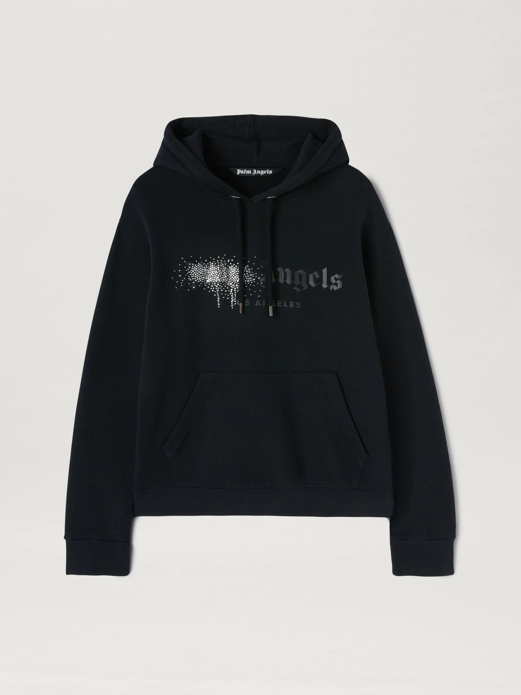 LONG SLEEVES HOODED SWEATSHIRT IN BLACK COTTON WITH RHINESTONE SPRAYED AT FRONT. "PALM ANGELS" LOGO AND "LOS ANGELES" PRINTED IN BLACK AT FRONT. REGULAR FIT. BLACK STRINGS AND KANGAROO POCKET. FABRIC 100% COTTON - RIB DETAIL 5% ELASTAN 95% COTTON - DETAIL 100% GLASS MODEL KEVIN WEARS SIZE M HEIGHT: 6’1" (185 CM) CHEST: 33” (85 CM) WAIST: 28" (72 CM) HIPS: 36" (91 CM) PRODUCT ID: PMBB003F22FLE0011010