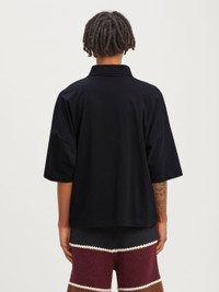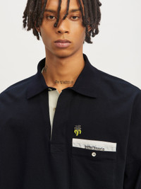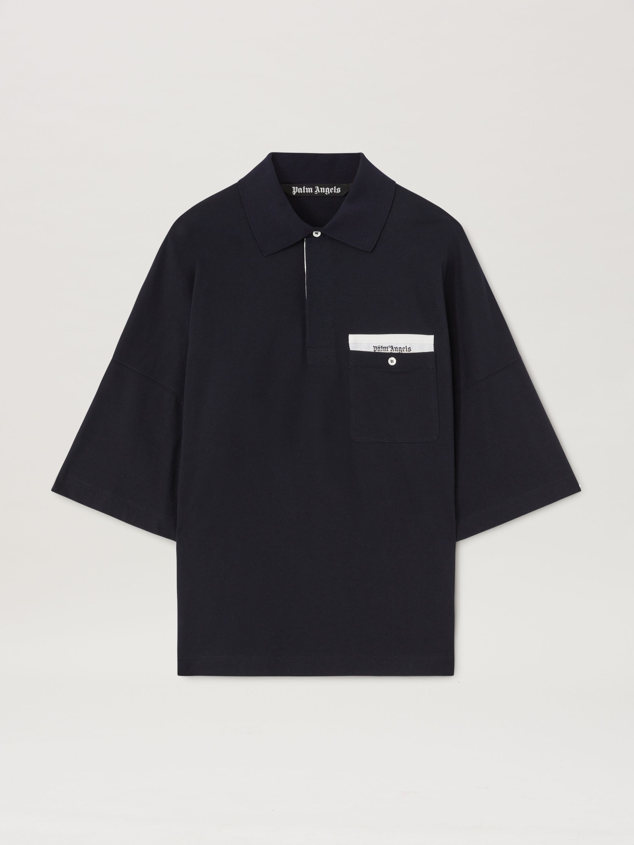 Navy blue men's polo shirt with oversize fit and short sleeves, front pocket edged with white tape with Palm Angels logo printed in black and white button. FABRIC 100% COTTON DETAIL 1 100% COTTON DETAIL 2 100% COTTON DETAIL 3 100% POLYESTER MODEL ISMAEL WEARS SIZE M HEIGHT: 6’2" (188 CM) CHEST: 38" (98 CM) WAIST: 30" (78 CM) HIPS: 37" (94 CM) PRODUCT ID: PMGB016E23JER0014603