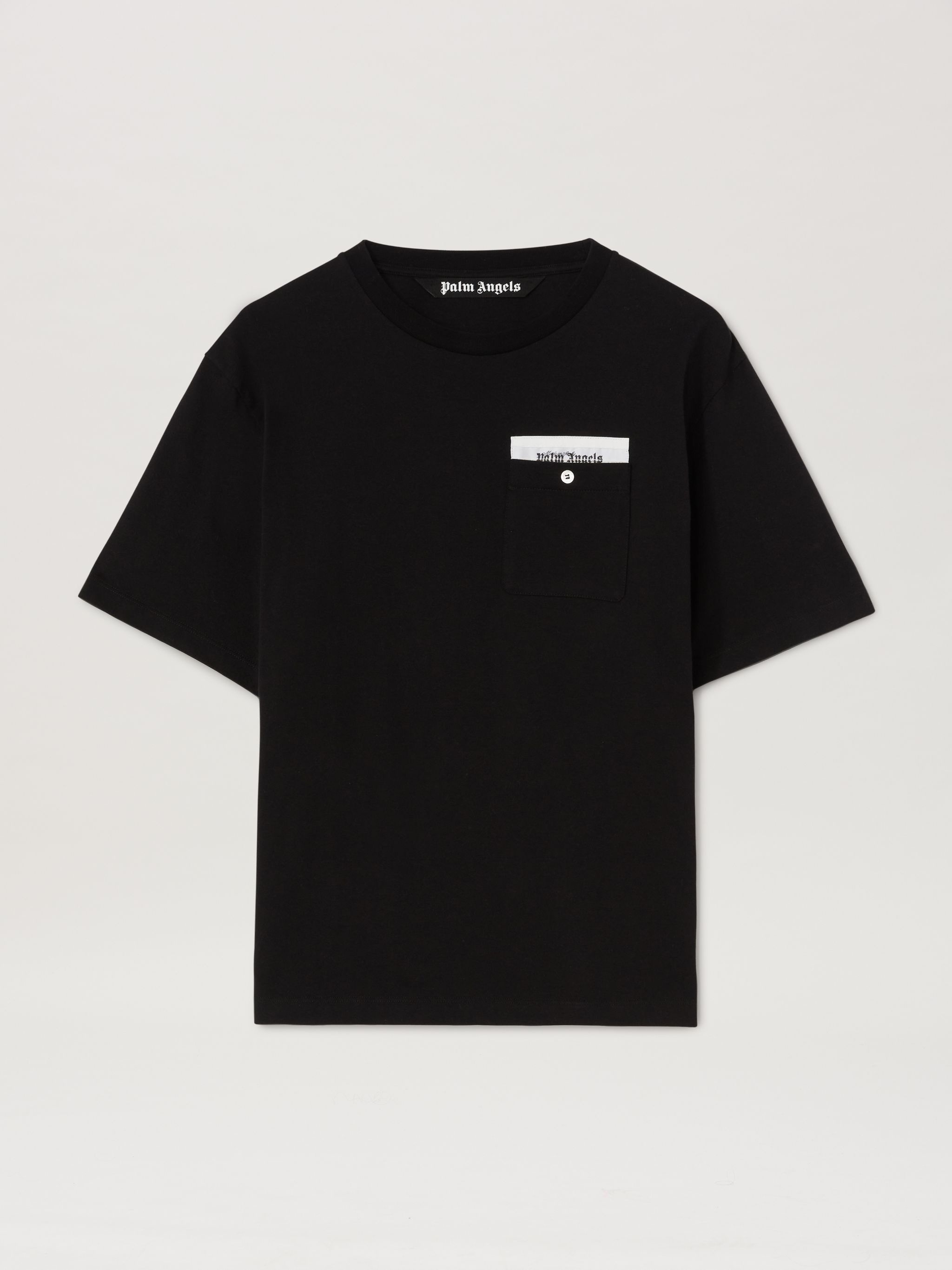 Regular fit black men's crew-neck T-shirt in certified organic cotton with short sleeves chest pocket closed by button and edged with white tape with Palm Angels logo printed in black. FABRIC 100% COTTON DETAIL 1 100% COTTON DETAIL 2 100% COTTON DETAIL 3 100% POLYESTER PRODUCT ID: PMAA088E23JER0011003