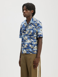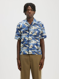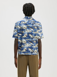 SHORT SLEEVES BOWLING SHIRT IN BLUE COTTON WITH SHARKS PRINTED ALL OVER. SPREAD COLLAR, BUTTON CLOSURE, FRONTAL POCKET. REGULAR FIT. FABRIC 100% COTTON MODEL PAOLO WEARS SIZE 48 HEIGHT: 6’2" (188 CM) CHEST: 33” (85 CM) WAIST: 28” (71 CM) HIPS: 36” (91 CM) PRODUCT ID: PMGA110S23FAB0054510