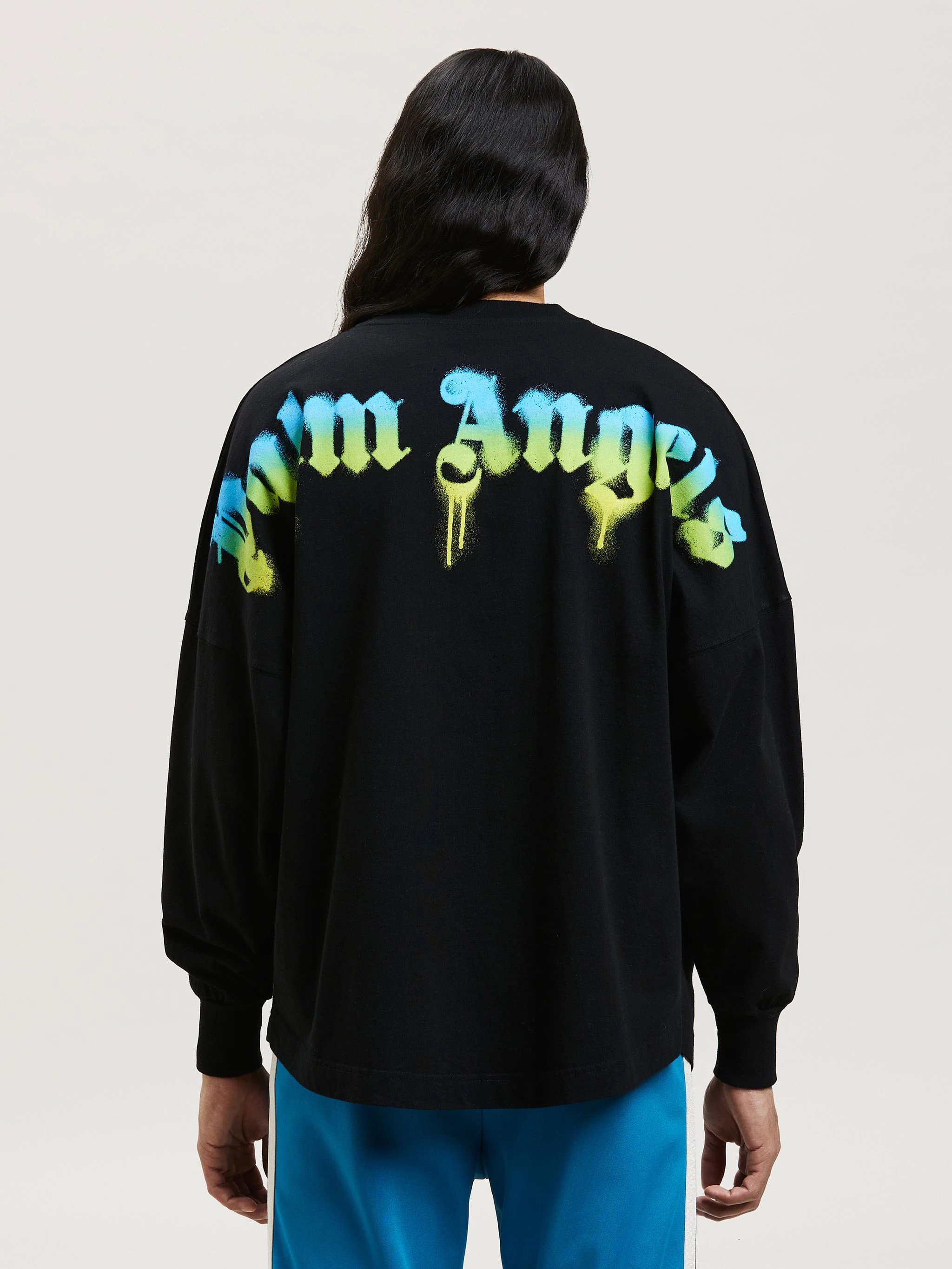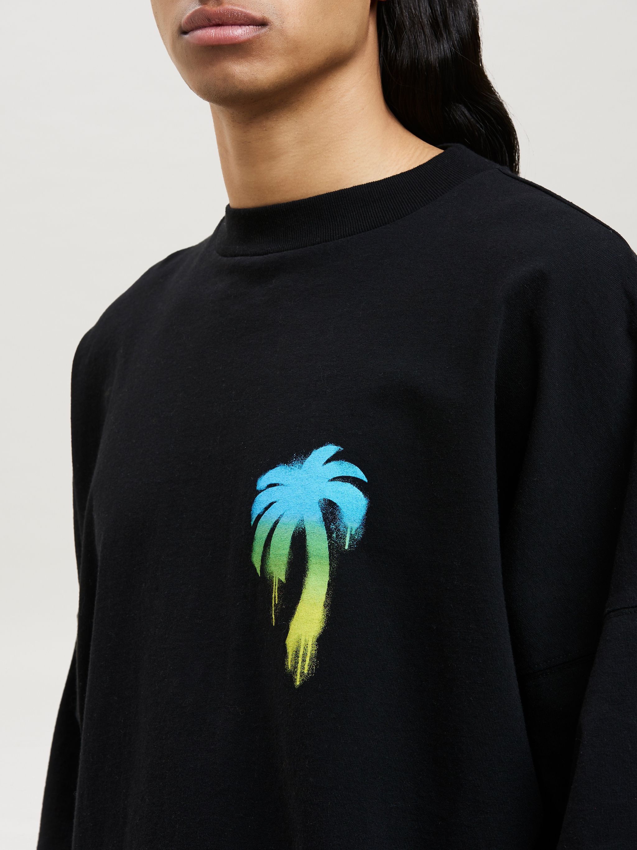 LONG SLEEVES T-SHIRT IN BLACK COTTON JERSEY WITH PALM TREE SPRAYED GRAPHIC PRINTED IN GREEN AND BLUE GRADIENT AT FRONT. "PALM ANGELS" LOGO PRINTED IN GREEN AND BLUE GRADIENT PRINTED AT BACK. CREWNECK COLLAR. OVERSIZE FIT. FABRIC 100% COTTON - RIB DETAIL 100% COTTON MODEL KEVIN WEARS SIZE M HEIGHT: 6’1" (185 CM) CHEST: 33” (85 CM) WAIST: 28" (72 CM) HIPS: 36" (91 CM) PRODUCT ID: PMAB001F22JER0031055