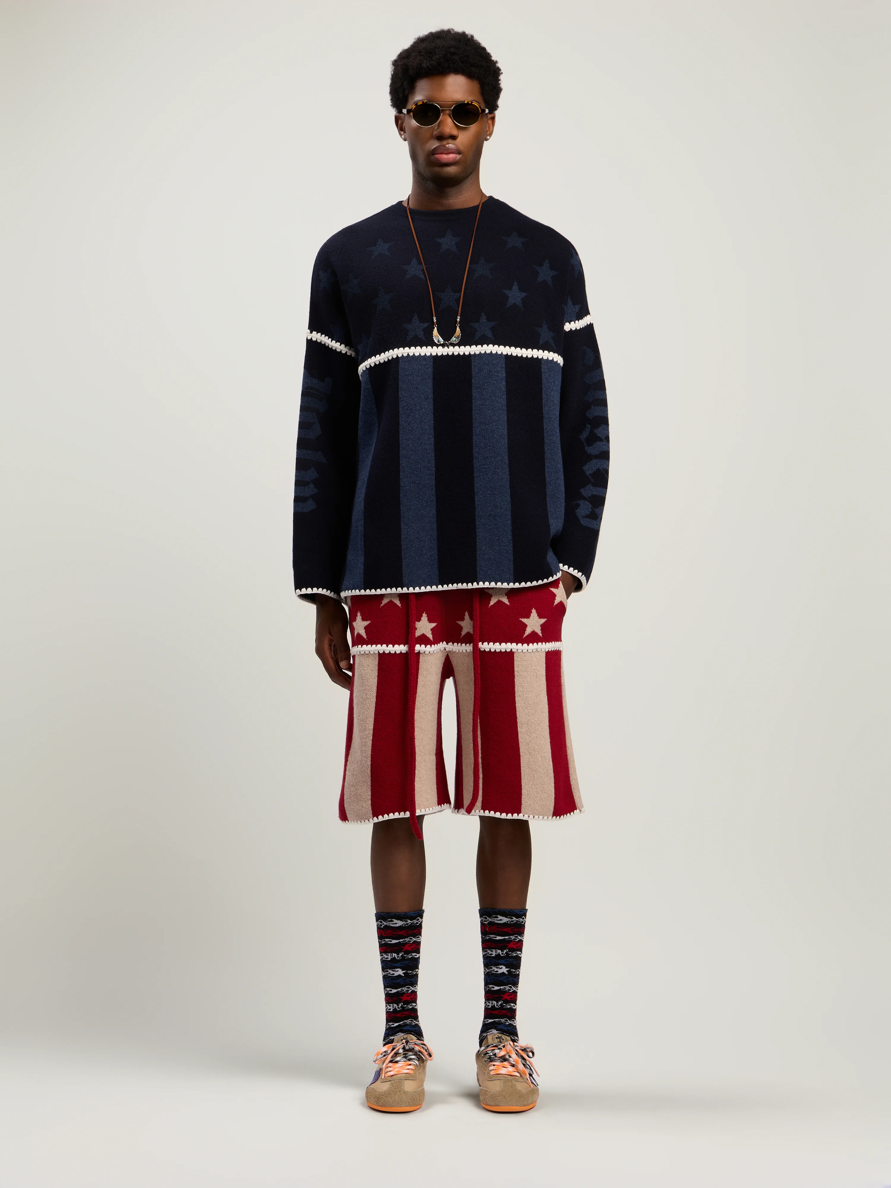 Crafted from premium knit material, these shorts embody a bold stars and stripes pattern, bringing a unique touch to streetwear. - Elastic waistband with adjustable drawstring - Bold stars and stripes design - Soft-knit construction - Contrasting stitched edges DETAILS - 80% Wool 20% Polyamide, Fabric: 44% Viscose 42% Polyamide 14% Wool - Code: PMHM015F25KNI001256F