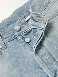 Palm Angels' jeans are cut for a regular straight fit and bear all the hallmarks of rugged workwear – a classic five-pocket design, embossed leather logo patch and an artfully tarnished distressed effect. The back pocket is embroidered with a curlicued logo. Size & Fit - Fits true to size. Take your normal size - Regular-straight leg, high-rise style - Mid-weight, non-stretchy fabric - Model is shown wearing a 30 - Model measures: waist size 30, height 6'0"/ 183cm Details & Care - Light-blue denim - Button fastenings - 100% cotton; lining: 65% polyester, 35% cotton - Machine wash