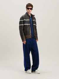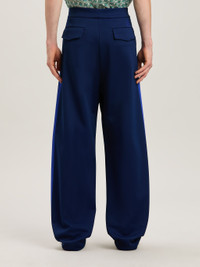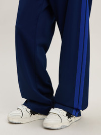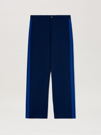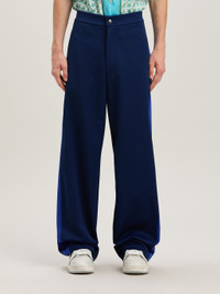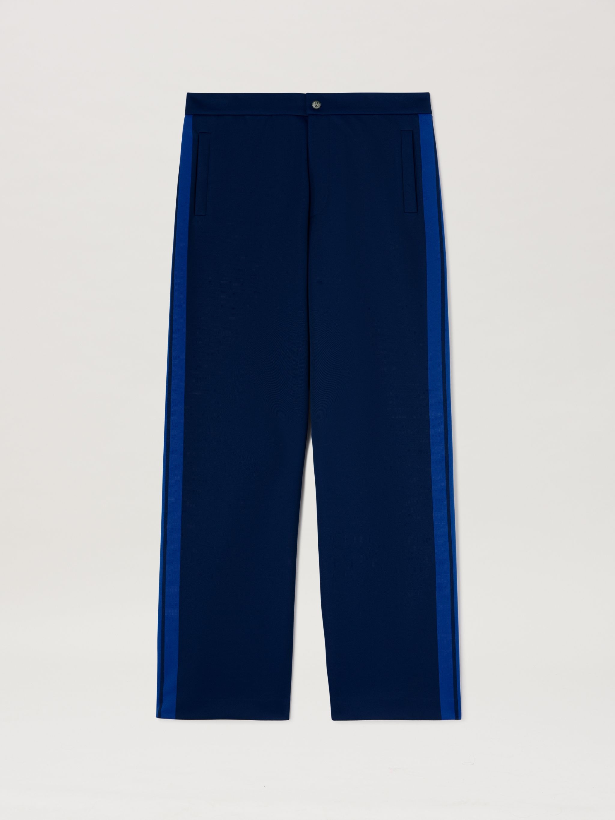 Vintage fit and tailored details give a new style to the iconic tracksuit. Men's navy blue track pants with wide legs, button closure and back flap pockets. MANUEL WEARS SIZE M HEIGHT: 6' 1” (185 CM) BUST: 34.5” (87 CM) WAIST: 26” (66 CM) HIPS: 33” (85 CM) PRODUCT ID: PMCJ044S25FAB0014645