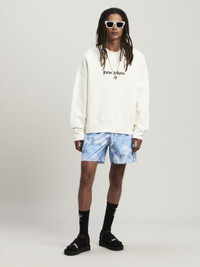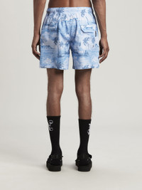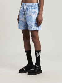 Witty little prints to brighten the new season. Men's blue swim shorts with sunset print and small Palm Angels lettering, elastic waistband, white drawstring and flap pocket on back. Mohamed wears size M Height: 6' 1"" (185 cm) Bust: 34"" (86 cm) Waist: 28"" (71 cm) Hips: 37"" (94 cm) PRODUCT ID: PMFD002S24FAB0034949
