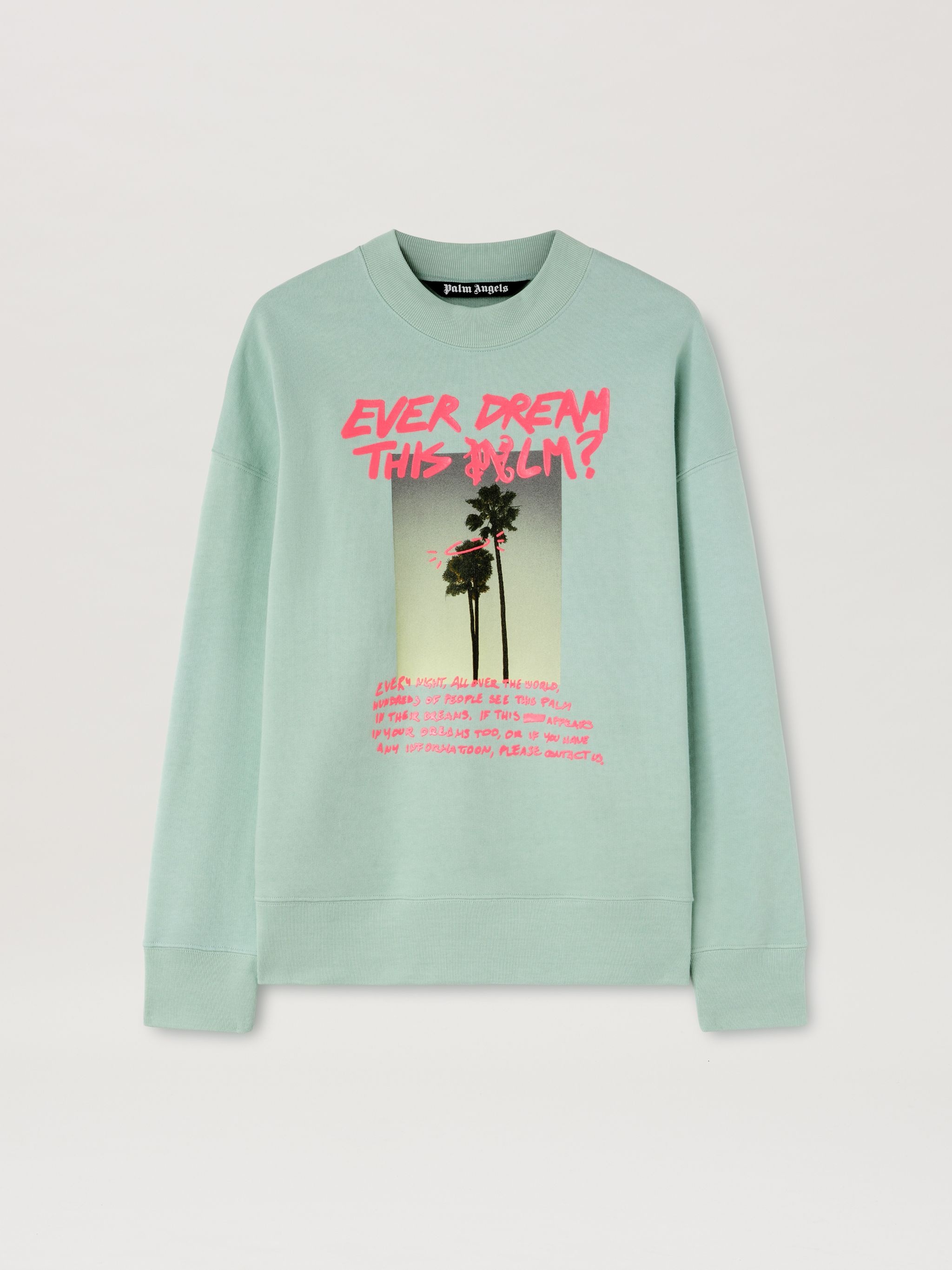 Messages and quotes that fit your personality. Men's pale blue crewneck sweatshirt with a photo taken from the iconic book “Palm Angels” by Francesco Ragazzi, lettering and "Palm Dream" message in fuchsia. Mohamed wears size M Height: 6' 1"" (185 cm) Bust: 34"" (86 cm) Waist: 28"" (71 cm) Hips: 37"" (94 cm) PRODUCT ID: PMBA026S24FLE0035168
